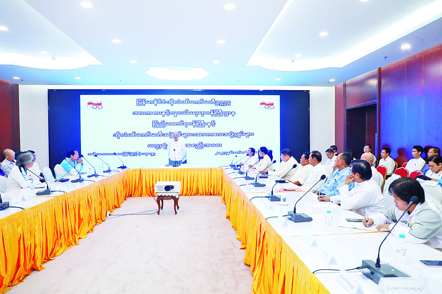 ဒုတိယအကြိမ် မြန်မာနိုင်ငံအိုလံပစ်ကော်မတီအစည်းအဝေးကို ယနေ့နံနက်ပိုင်းတွင် ရန်ကုန်မြို့ အမျိုးသားအားကစားပြိုင်ပွဲရုံ (၁) သုဝဏ္ဏရှိ ပတ္တမြားခန်းမ၌ ကျင်းပရာ မြန်မာနိုင်ငံအိုလံပစ်ကော်မတီဥက္ကဋ္ဌ အားကစားနှင့်လူငယ်ရေးရာဝန်ကြီးဌာနနှင့် ဟိုတယ်နှင့်ခရီးသွားလာရေးဝန်ကြီးဌာန ပြည်ထောင်စုဝန်ကြီး Jeng Phang နော်တောင်၊ မြန်မာနိုင်ငံအိုလံပစ်ကော်မတီ ဒုတိယဥက္ကဋ္ဌ ဒုတိယဝန်ကြီး ဦးထိန်လင်း၊ မြန်မာနိုင်ငံအိုလံပစ်ကော်မတီအဖွဲ့ဝင်များ၊ မြန်မာနိုင်ငံအိုလံပစ်ကော်မတီ တွဲဖက်အတွင်းရေးမှူးများနှင့် အားကစားနှင့်ကာယပညာဦးစီးဌာနမှ တာဝန်ရှိပုဂ္ဂိုလ်များ၊ မြန်မာနိုင်ငံအားကစားအဖွဲ့ချုပ်ဥက္ကဋ္ဌများ၊ ဒုတိယဥက္ကဋ္ဌများ၊ အတွင်းရေးမှူးများနှင့် တွဲဖက်အတွင်းရေးမှူးများ တက်ရောက်ကြသည်။