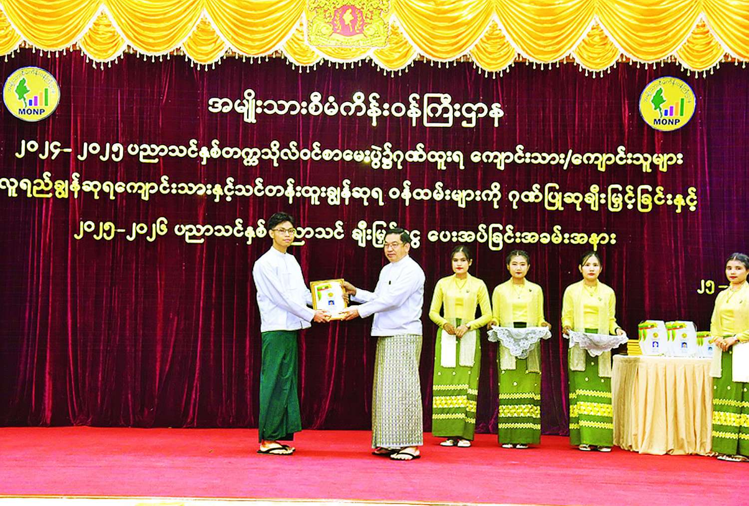 ၂၀၂၄-၂၀၂၅ ပညာသင်နှစ် တက္ကသိုလ်ဝင်စာမေးပွဲတွင် ထူးချွန်စွာအောင်မြင်ခဲ့ကြသည့် အမျိုးသားစီမံကိန်းဝန်ကြီးဌာနရှိ ဝန်ထမ်းသားသမီးများဖြစ်သည့် ကျောင်းသား ကျောင်းသူများ၊ လူရည်ချွန်ဆုရကျောင်းသားနှင့် သင်တန်းထူးချွန်ဆုရဝန်ထမ်းများအား ဂုဏ်ပြုဆုချီးမြှင့်ခြင်းနှင့် ၂၀၂၅-၂၀၂၆ ပညာသင်နှစ်အတွက် ပညာသင်ချီးမြှင့်ငွေ ပေးအပ်ခြင်းအခမ်းအနားကို ယနေ့မွန်းလွဲပိုင်းတွင် နေပြည်တော်ရှိ အမျိုးသားစီမံကိန်းဝန်ကြီးဌာန အစည်းအဝေးခန်းမ၌ကျင်းပသည်။