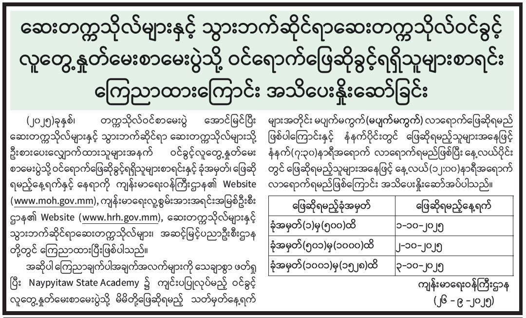 ဆေးတက္ကသိုလ်များနှင့် သွားဘက်ဆိုင်ရာဆေးတက္ကသိုလ်ဝင်ခွင့် လူတွေ့နှုတ်မေးစာမေးပွဲသို့ ဝင်ရောက်ဖြေဆိုခွင့်ရရှိသူများစာရင်း ကြေညာထားကြောင်း အသိပေးနှိုးဆော်ခြင်း