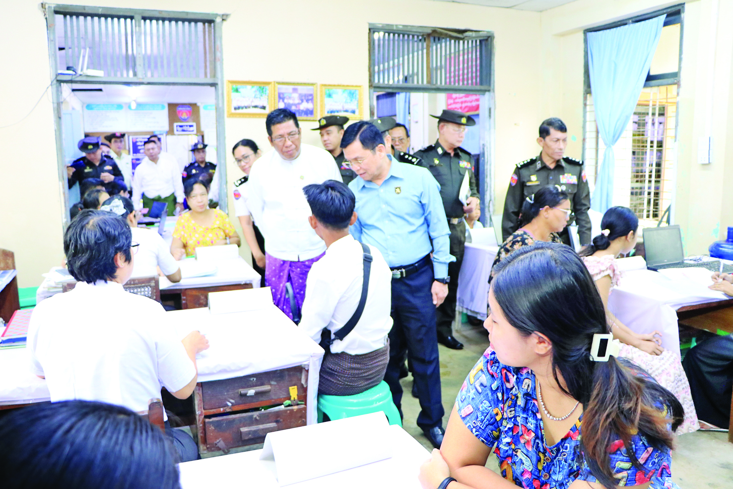 ထို့နောက် ပြည်ထောင်စုဝန်ကြီးနှင့် အဖွဲ့သည် ဝန်ထမ်းများက ဒေသခံပြည်သူများကို ပန်းခင်းစီမံချက်အဆင့် (၃) ဖြင့် အိမ်ထောင်စုလူဦးရေစာရင်းနှင့် နိုင်ငံသားစိစစ်ရေးကတ်ပြား ထုတ်ပေးနိုင်ရေးအတွက် လုပ်ထုံးလုပ်နည်းနှင့်အညီ စိစစ်၍ One Stop Service ဖြင့် လုပ်ငန်းစဉ်အဆင့်ဆင့် ဆောင်ရွက်နေမှုနှင့် နိုင်ငံသားစိစစ်ရေးကတ်ပြားရရှိပြီးသူများ အား e-ID စနစ်ဖြင့် Biographic/ Biometric ကောက်ယူကာ Unique ID နံပါတ် တစ်ပါတည်း ဆောင်ရွက်ထုတ်ပေးနေမှုကို လှည့်လည်ကြည့်ရှုအားပေးသည်။