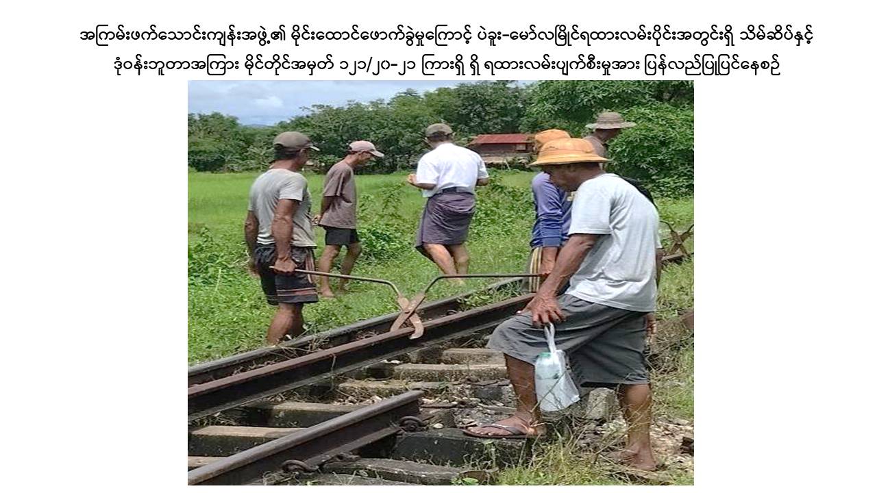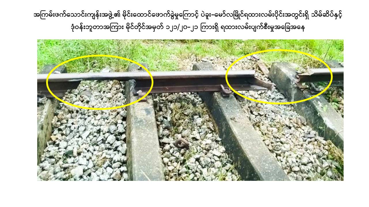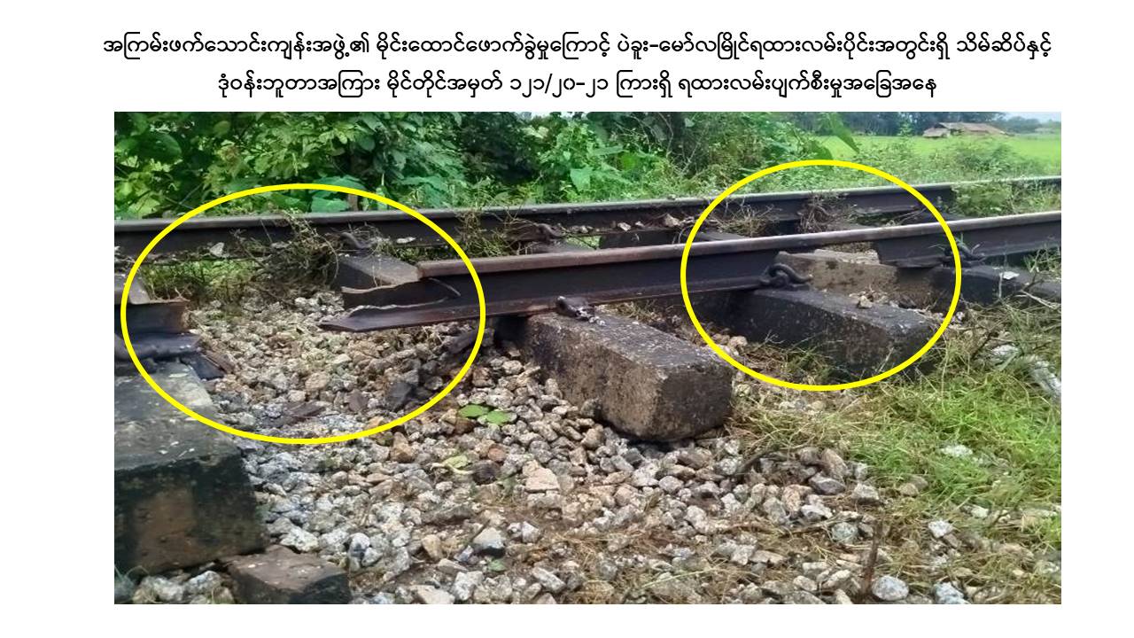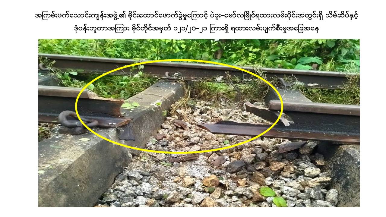အကြမ်းဖက်သောင်းကျန်းသူအဖွဲ့များအနေဖြင့် ၂၀၂၁ ခုနှစ်၊ ဖေဖော်ဝါရီလမှစ၍ ယခုအချိန်အထိ မြန်မာ့မီးရထားလမ်းကွန်ရက်တစ်ခုလုံးတွင် ရထားလမ်းနှင့် ရထားဘူတာနယ်မြေအတွင်း မိုင်းထောင်ဖောက်ခွဲဖျက်ဆီးခြင်း(၈၂)ကြိမ်၊ ရထားတံတား/သံလမ်းများအား မိုင်းထောင်ဖောက်ခွဲ ဖျက်ဆီးခြင်း (၁၇၈)ကြိမ်၊ ဘူတာအဆောက်အဦနှင့် ဝန်ထမ်းနေအိမ်များအား မီးရှို့ဖျက်ဆီးခြင်း(၁၆)ကြိမ် ကျူးလွန်ခဲ့ကြပြီး နိုင်ငံတော်ပိုင်ရထားစက်ခေါင်းနှင့် တွဲများ၊ ရထားလမ်းနှင့် တံတားများ၊ ခရီးသည်များနှင့် ကုန်စည်များ ထိခိုက်ပျက်စီးဆုံးရှုံးစေရေး၊ ရထားစီးခရီးသွားပြည်သူများအနေဖြင့် ရထားဖြင့်ခရီးသွားလာရာတွင် ကိုယ်စိတ်နှလုံးချမ်းမြေ့ပြီး အသက်အန္တရာယ်ကင်းရှင်းစွာဖြင့် လုံခြုံစိတ်ချစွာ သွားလာနိုင်မှုမရှိစေရေးအတွက် ရည်ရွယ်ပြီး ယခုကဲ့သို့ အကြိမ်ကြိမ်ကျူးလွန်ဖျက်ဆီးနေကြခြင်းဖြစ်သော်လည်း နိုင်ငံတော်အစိုးရအနေဖြင့် အများပြည်သူ ခရီးသွားလာမှုနှင့် ကုန်စည်ပို့ဆောင်မှုအဆင်ပြေချောမွေ့မြန်ဆန်စေရေးအတွက် ရထားလမ်းနှင့် အခြေခံအဆောက်အဦများ ပိုမိုတိုးတက်ကောင်းမွန်လာစေရေးနှင့် ရထားပို့ဆောင်ရေးစနစ် အဆင့်မြှင့်တင်ရေးစီမံကိန်းလုပ်ငန်းများကို ရည်မှန်းချက်ထားရှိ၍ အစဉ်တစိုက် အလေးထား စီမံဆောင်ရွက်ပေးလျက်ရှိကြောင်း သတင်းရရှိသည်။