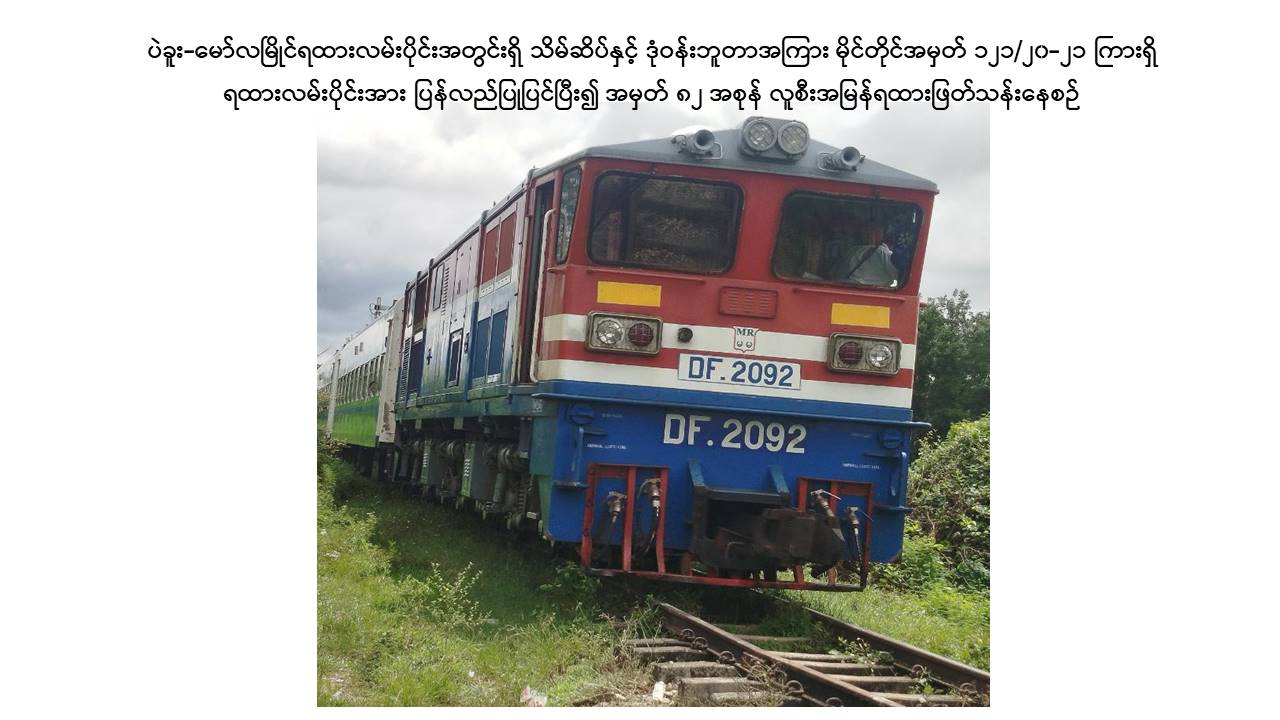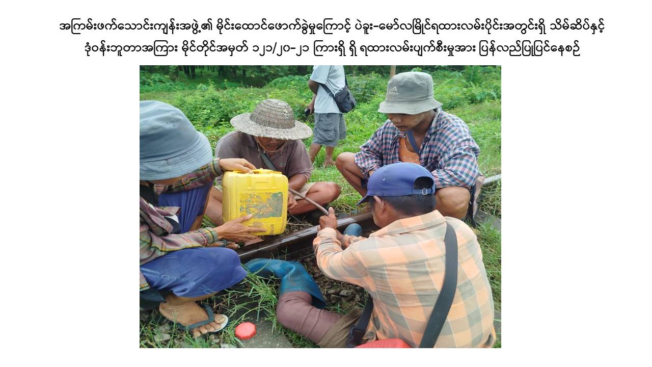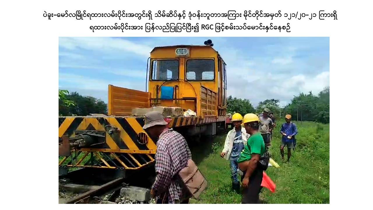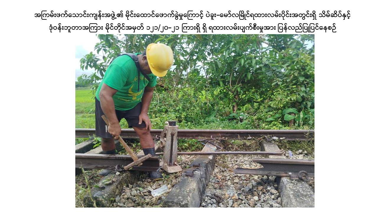 အကြမ်းဖက်သောင်းကျန်းသူအဖွဲ့များအနေဖြင့် ၂၀၂၁ ခုနှစ်၊ ဖေဖော်ဝါရီလမှစ၍ ယခုအချိန်အထိ မြန်မာ့မီးရထားလမ်းကွန်ရက်တစ်ခုလုံးတွင် ရထားလမ်းနှင့် ရထားဘူတာနယ်မြေအတွင်း မိုင်းထောင်ဖောက်ခွဲဖျက်ဆီးခြင်း(၈၂)ကြိမ်၊ ရထားတံတား/သံလမ်းများအား မိုင်းထောင်ဖောက်ခွဲ ဖျက်ဆီးခြင်း (၁၇၈)ကြိမ်၊ ဘူတာအဆောက်အဦနှင့် ဝန်ထမ်းနေအိမ်များအား မီးရှို့ဖျက်ဆီးခြင်း(၁၆)ကြိမ် ကျူးလွန်ခဲ့ကြပြီး နိုင်ငံတော်ပိုင်ရထားစက်ခေါင်းနှင့် တွဲများ၊ ရထားလမ်းနှင့် တံတားများ၊ ခရီးသည်များနှင့် ကုန်စည်များ ထိခိုက်ပျက်စီးဆုံးရှုံးစေရေး၊ ရထားစီးခရီးသွားပြည်သူများအနေဖြင့် ရထားဖြင့်ခရီးသွားလာရာတွင် ကိုယ်စိတ်နှလုံးချမ်းမြေ့ပြီး အသက်အန္တရာယ်ကင်းရှင်းစွာဖြင့် လုံခြုံစိတ်ချစွာ သွားလာနိုင်မှုမရှိစေရေးအတွက် ရည်ရွယ်ပြီး ယခုကဲ့သို့ အကြိမ်ကြိမ်ကျူးလွန်ဖျက်ဆီးနေကြခြင်းဖြစ်သော်လည်း နိုင်ငံတော်အစိုးရအနေဖြင့် အများပြည်သူ ခရီးသွားလာမှုနှင့် ကုန်စည်ပို့ဆောင်မှုအဆင်ပြေချောမွေ့မြန်ဆန်စေရေးအတွက် ရထားလမ်းနှင့် အခြေခံအဆောက်အဦများ ပိုမိုတိုးတက်ကောင်းမွန်လာစေရေးနှင့် ရထားပို့ဆောင်ရေးစနစ် အဆင့်မြှင့်တင်ရေးစီမံကိန်းလုပ်ငန်းများကို ရည်မှန်းချက်ထားရှိ၍ အစဉ်တစိုက် အလေးထား စီမံဆောင်ရွက်ပေးလျက်ရှိကြောင်း သတင်းရရှိသည်။