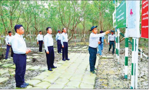 ယင်းနောက် တိုင်းဒေသကြီးဝန်ကြီးချုပ်က ဧရာဝတီတိုင်းဒေသကြီးအတွင်း ပင်လယ်ကမ်းရိုးတန်းနှင့် ဒီရေရောက်ဒေသများတွင် ပင်လယ်ရေမျက်နှာပြင်မြင့်တက်မှု၊ ကမ်းရိုးတန်းရေတိုက်စားမှုနှင့် မုန်တိုင်းဒဏ်ကာကွယ်ရန်၊ ရေနေသတ္တဝါများ၏ ဂေဟစနစ်ကို အကာအကွယ်ပေးနိုင်ရန်အတွက် လမုပင်နှင့် အုန်းပင်များ တိုးမြှင့်စိုက်ပျိုးနေမှု အခြေအနေများကို ရှင်းလင်းပြောကြားသည်။