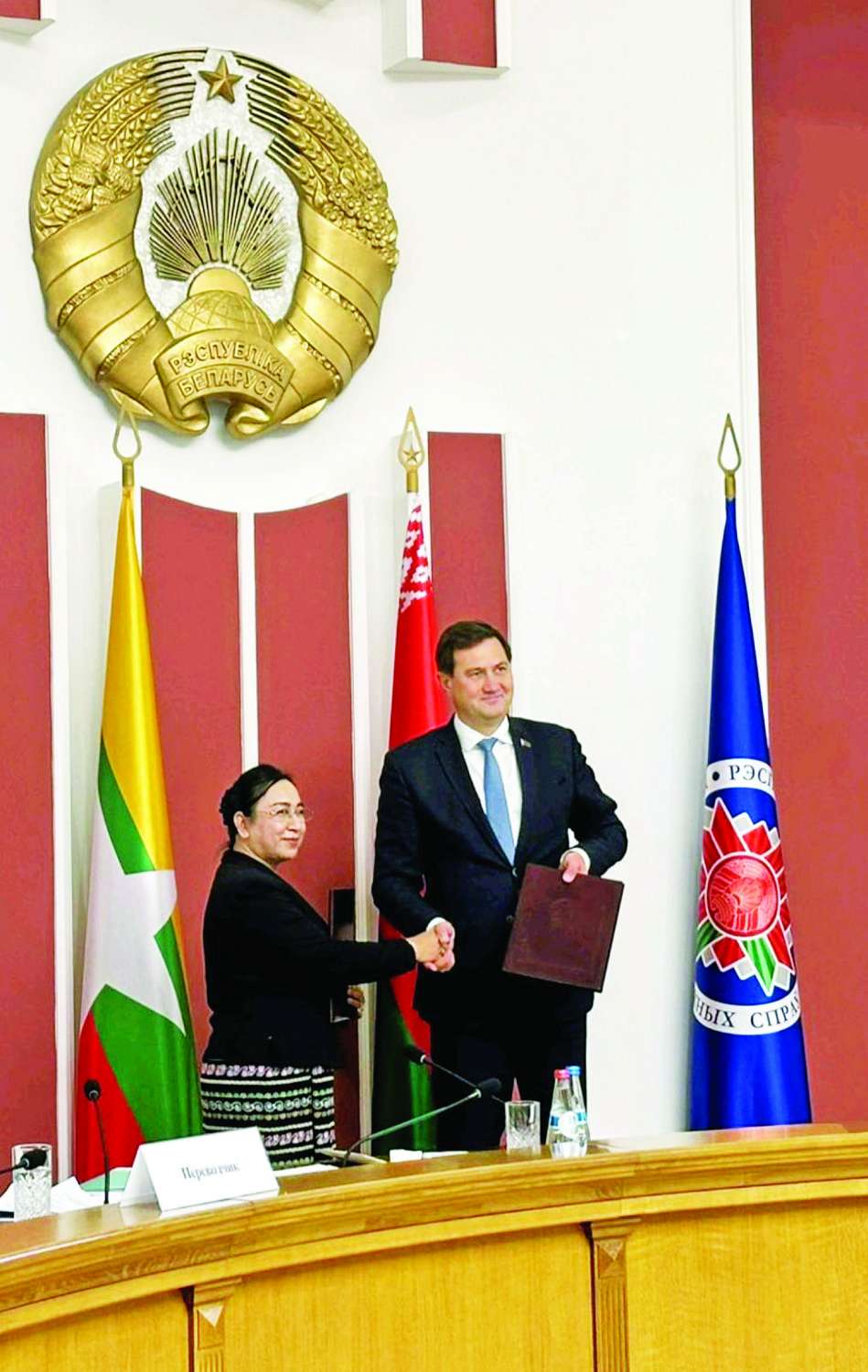 မြန်မာ-ဘယ်လာရုစ် ကုန်သွယ်ရေးနှင့် စီးပွားရေးပူးပေါင်းဆောင်ရွက်မှုပူးတွဲကော်မတီ၏ ဒုတိယအကြိမ်အစည်းအဝေးကို အောက်တိုဘာ ၂ ရက်တွင် ဘယ်လာရုစ်နိုင်ငံခြားရေးဝန်ကြီးဌာန၌ ပူးတွဲဥက္ကဋ္ဌများဖြစ်ကြသည့် ရင်းနှီးမြှုပ်နှံမှုနှင့်နိုင်ငံခြားစီးပွားဆက်သွယ်ရေးဝန်ကြီးဌာန ပြည်ထောင်စုဝန်ကြီး ဒေါက်တာဝါဝါမောင်နှင့် ဘယ်လာရုစ်သမ္မတနိုင်ငံ နိုင်ငံခြားရေးဝန်ကြီးဌာန ဝန်ကြီးမစ္စတာမက်ဆင်း ရူဇန်ကော့ဗ်တို့က ဦးဆောင်ကျင်းပခဲ့သည်။
