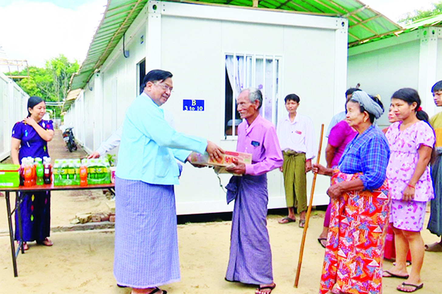 ပြည်ထောင်စုဝန်ကြီး ဒေါက်တာချာလီသန်း ယာယီအဆောက်အအုံများတွင် ဝန်ထမ်းများ နေရာချထားမှုအခြေအနေ ကြည့်ရှုစစ်ဆေး၍ ထောက်ပံ့ပစ္စည်းများပေးအပ်