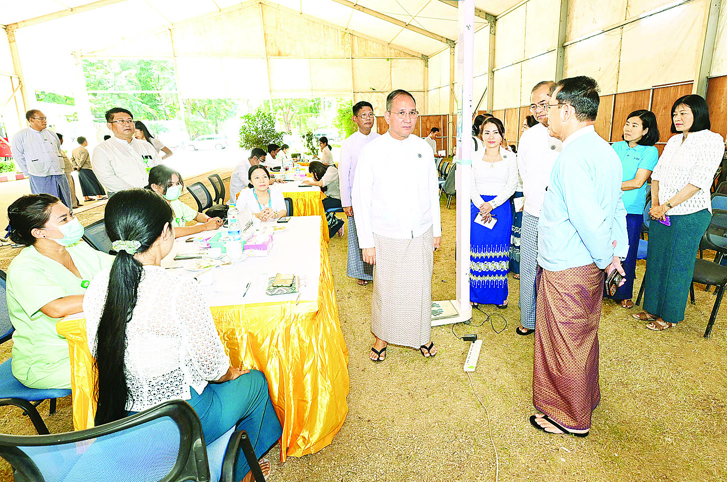ထိုသို့ ကျန်းမာရေးစောင့်ရှောက်ခြင်း ဆောင်ရွက်ပေးနေမှုကို ပြန်ကြားရေးဝန်ကြီးဌာန ပြည်ထောင်စုဝန်ကြီး ဦးမောင်မောင်အုန်း၊ အလုပ်သမားဝန်ကြီးဌာန ပြည်ထောင်စုဝန်ကြီး ဦးအောင်ကျော်ဟိုး၊ ဒုတိယဝန်ကြီး ဦးဝင်းရှိန်နှင့် တာဝန်ရှိသူများသည် လူမှုဖူလုံရေးအဖွဲ့ဆရာဝန်များနှင့် ကျန်းမာရေးဝန်ထမ်းများက ပြန်ကြားရေးဝန်ကြီးဌာနမှ အာမခံဝန်ထမ်းများအား ကျန်းမာရေးစောင့်ရှောက်မှုပေးနိုင်ရန် မှတ်ပုံတင်စာရင်းသွင်းခြင်း၊ သွေးပေါင်ချိန် ခြင်းနှင့် အထွေထွေကျန်းမာရေးဆိုင်ရာ စစ်ဆေးဆောင်ရွက်ပေးနေမှုများကို ကြည့်ရှုအားပေးကြသည်။