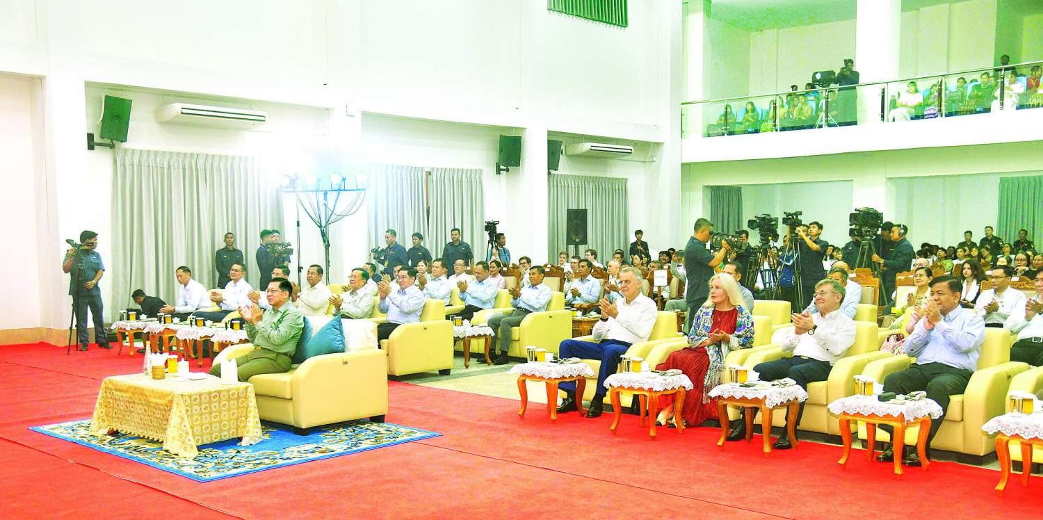 ဦးစွာနိုင်ငံတော် ယာယီသမ္မတနိုင်ငံတော်လုံခြုံရေးနှင့် အေးချမ်းသာယာရေး ကော်မရှင်ဥက္ကဋ္ဌနှင့် အခမ်းအနားတက်ရောက်လာကြသူများသည် “ယဉ်ကျေးမှုဖလှယ်မှုမှသည် ချစ်ကြည် ရင်းနှီးမှုများဆီသို့” Video Clip ကိုကြည့်ရှုကြသည်။