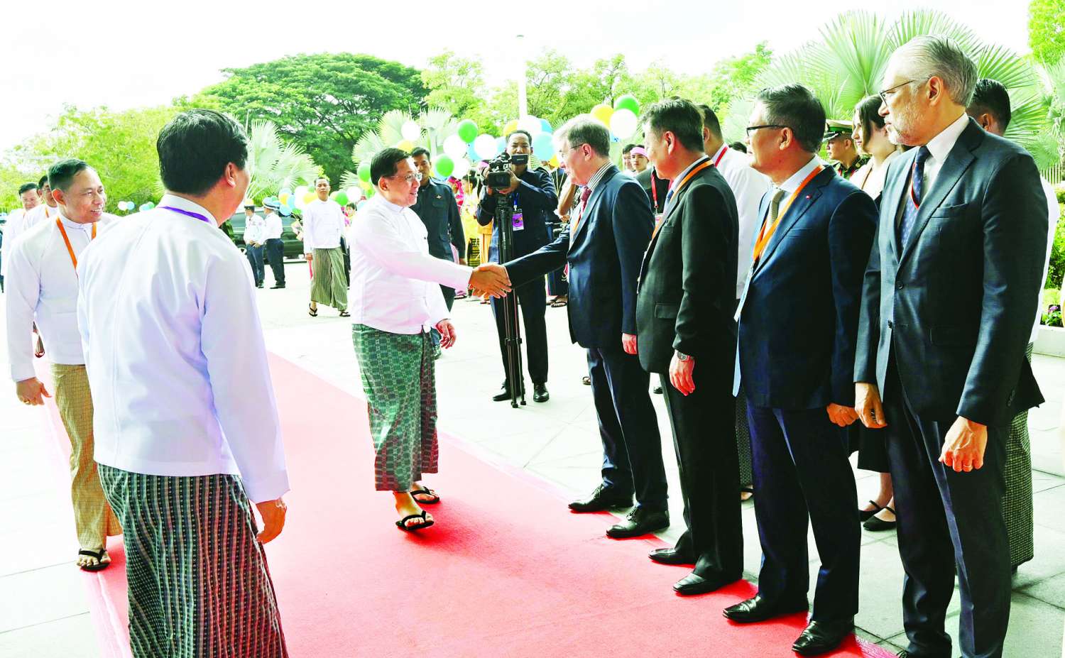 ပြည်ထောင်စုသမ္မတမြန်မာနိုင်ငံတော် ယာယီသမ္မတ နိုင်ငံတော်လုံခြုံရေးနှင့်အေးချမ်းသာယာရေးကော်မရှင် ဥက္ကဋ္ဌ အမျိုးသားစည်းလုံးညီညွတ်ရေးနှင့် ငြိမ်းချမ်းရေးဖော်ဆောင်မှု ဗဟိုကော်မတီ ဥက္ကဋ္ဌ တပ်မတော်ကာကွယ်ရေးဦးစီးချုပ် ဗိုလ်ချုပ်မှူးကြီး မင်းအောင်လှိုင် တစ်နိုင်ငံလုံး ပစ်ခတ်တိုက်ခိုက်မှုရပ်စဲရေး သဘောတူစာချုပ်(NCA) (၁၀)နှစ်ပြည့် နှစ်ပတ်လည်နေ့ အခမ်းအနားသို့ တက်ရောက်မိန့်ခွန်းပြောကြား