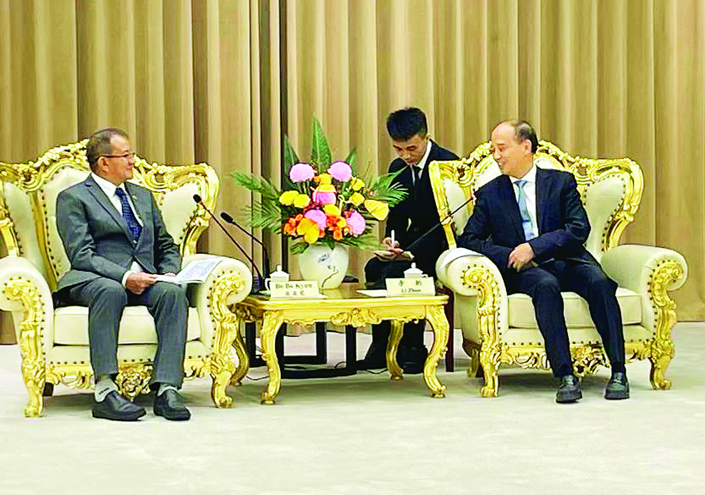 ဒုတိယဝန်ကြီးသည် အောက်တိုဘာ ၁၂ ရက် နံနက်ပိုင်းတွင် အာဆီယံ-တရုတ် ဗဟိုဌာန၏ အထွေထွေအတွင်းရေးမှူးချုပ် Mr. Shi Zhongjun နှင့် လည်းကောင်း၊ ဟဲနန်ပြည်နယ် ဒုတိယအုပ်ချုပ်ရေးမှူး Mr. Li Zhou နှင့် လည်းကောင်း သီးခြားစီတွေ့ဆုံ၍ နှစ်နိုင်ငံပူးပေါင်းပြီး မျိုးကောင်းမျိုးသန့်များ သုတေသနပြုထုတ်လုပ်နိုင်ရေး၊ မြန်မာနိုင်ငံတွင် အဆင့်မြင့်နည်းပညာများ ပေါင်းစပ်အသုံးပြုနိုင်သည့် လယ်ယာသုံးစက်ကိရိယာများ ထုတ်လုပ်၍ ပိုမိုတွင်ကျယ်စွာအသုံးပြုနိုင်ရေးအတွက် ပူးပေါင်းဆောင်ရွက်နိုင်ရန်၊ ဆည်မြောင်းနှင့် ရေပေးဝေမှုနည်းစနစ်များ ဖွံ့ဖြိုးတိုးတက်စေရေးအတွက် အင်ဂျင်နီယာဆိုင်ရာ နည်းပညာများ၊ စိုက်ပျိုးရေး နည်းပညာများ ပူးပေါင်းဖလှယ်မှုအစီအစဉ်အရ နည်းပညာဆွေးနွေးပွဲများ၊ သင်တန်းများ ပိုမိုပို့ချပေးနိုင်ရန်နှင့် စိုက်ပျိုးရေးကဏ္ဍ၊ ဆည်မြောင်းနှင့်ရေအရင်းအမြစ် ကဏ္ဍများနှင့် ပတ်သက်သည့် ဘာသာရပ်များတွင် ဒီပလိုမာနှင့်ဘွဲ့လွန်ဒီဂရီ ပညာသင်ဆုများ ဆည်းပူးနိုင်ရေး ပိုမိုဆောင်ရွက်ပေးရန် ကိစ္စရပ်များကို ဆွေးနွေးညှိနှိုင်းခဲ့ကြသည်။