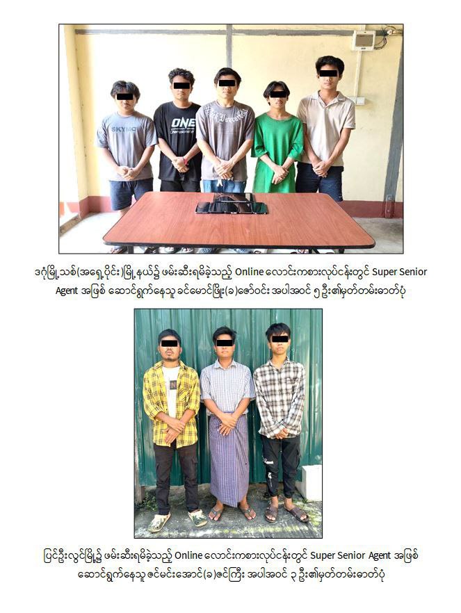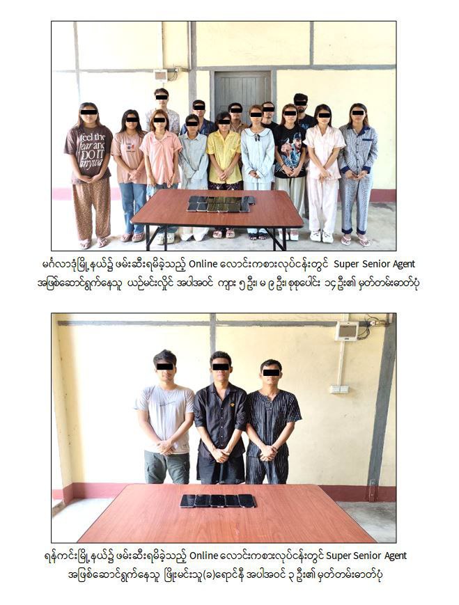ဖြစ်စဉ်တွင် Online လောင်းကစားလုပ်ငန်းလုပ်ကိုင်သူ တရားခံ အမျိုးသား ၁၇ ဦး၊ အမျိုးသမီး ၁၀ ဦးစုစုပေါင်း ၂၇ ဦးအား ဖမ်းဆီးရမိခဲ့ပြီး ၎င်းတို့နှင့်အတူ လက်ကိုင်ဖုန်း ၄၉ လုံး၊ လက်တော့ပ် ၂ လုံး၊ Tablet ၂ လုံး၊ မော်တော်ယာဉ် ၈ စီးတို့အား သိမ်းဆည်းရမိခဲ့သဖြင့် ထိရောက်စွာ အမှုဖွင့်လှစ်အရေးယူနိုင်ရေး ဆောင်ရွက်လျက်ရှိကြောင်းနှင့် မိဘပြည်သူများအနေဖြင့် ထိုကဲ့သို့ Online လောင်းကစားလုပ်ငန်း ပြုလုပ်နေသူများအားသိရှိပါက သက်ဆိုင်ရာလုံခြုံရေးအဖွဲ့အစည်းများထံသို့ လျှို့ဝှက်စွာ သတင်းပေးပို့ပါရန် အသိပေးသတင်းထုတ်ပြန်အပ်ပါသည်။
