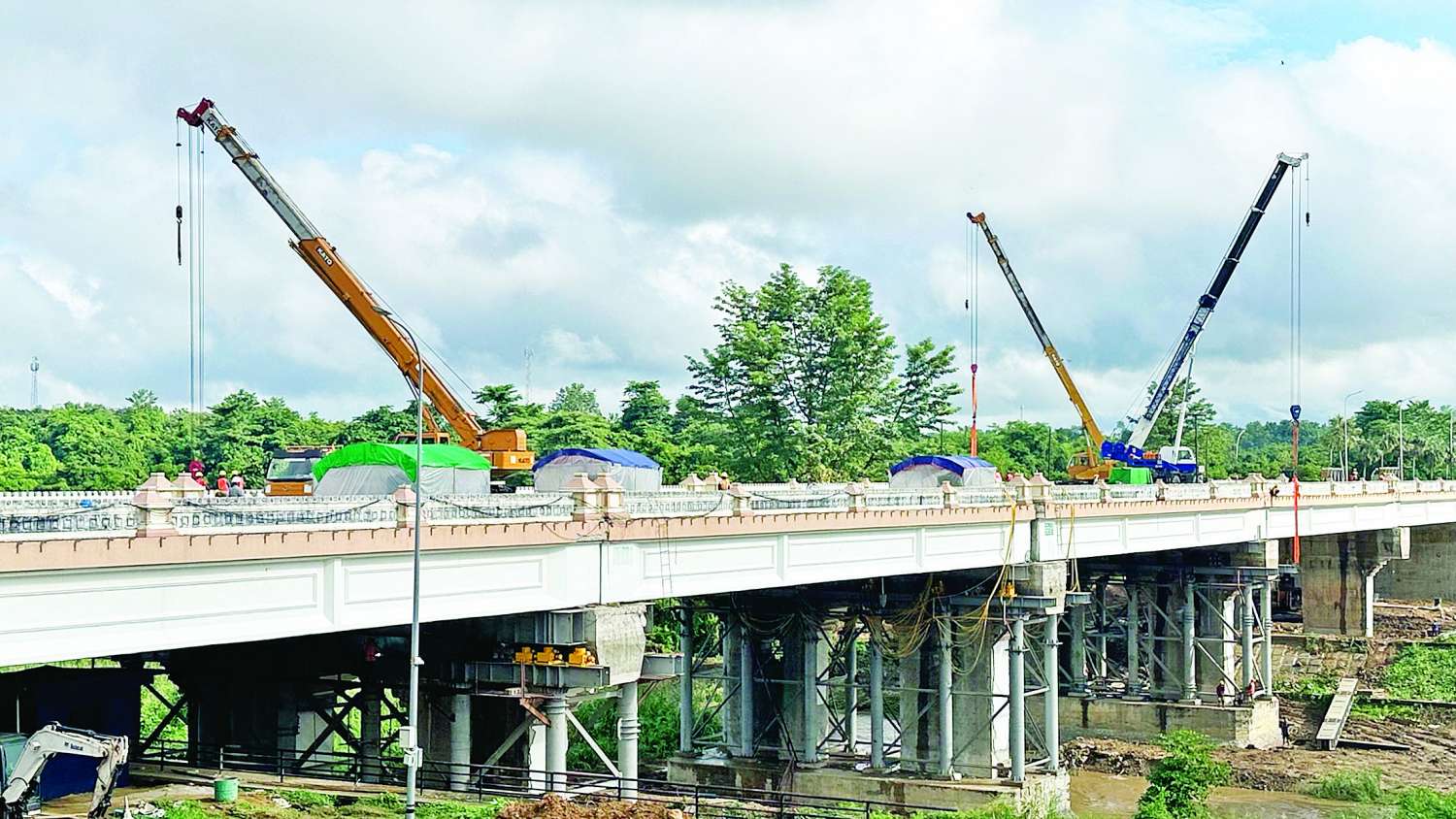 ဦးစွာ နိုင်ငံတော်ယာယီသမ္မတ နိုင်ငံတော်လုံခြုံရေးနှင့်အေးချမ်းသာယာရေးကော်မရှင်ဥက္ကဋ္ဌသည် လွှတ်တော်အဝင်အမှတ်(၁)တံတားနေရာသို့ရောက်ရှိကြရာ ဆောက်လုပ်ရေးဝန်ကြီးဌာန ပြည်ထောင်စုဝန်ကြီးနှင့်တာဝန်ရှိသူများက ငလျင်ဘေးဒဏ်ကြောင့် တံတားထိခိုက်ပျက်စီးမှုနှင့် ရွေ့လျားမှုများဖြစ်ပေါ်ခဲ့ခြင်းအားပြန်လည်ပြုပြင်ရာ၌ တံတားတစ်စင်းတွင်ခန်းဖွင့်ငါးခုပါဝင်ပြီး ခန်းဖွင့်တစ်ခုလျှင် အလေးချိန် တန် ၁၅၀၀ ခန့်ရှိသဖြင့် တံတားတစ်စင်းလုံး စုစုပေါင်းအလေးချိန် တန် ၇၅၀၀ ခန့်အား 3 D Synchronise jack အသုံးပြုသည့် ခေတ်မီနည်းပညာဖြင့်ပင့်တင်၍ ပြုပြင်ခဲ့သည့်အခြေအနေများနှင့် လုပ်ငန်းဆောင်ရွက်ပြီးစီးမှုအခြေအနေများကို ရှင်းလင်းတင်ပြကြသည်။