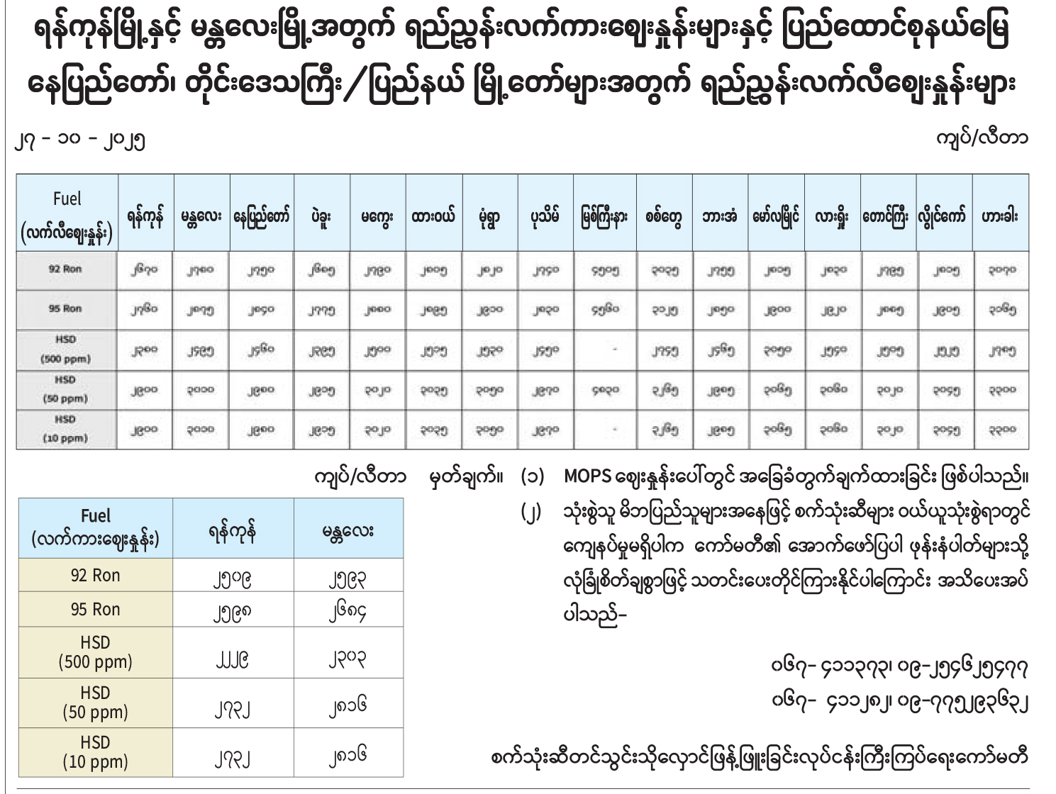 ရန်ကုန်မြို့နှင့် မန္တလေးမြို့အတွက် ရည်ညွှန်းလက်ကားဈေးနှုန်းများနှင့် ပြည်ထောင်စုနယ်မြေ နေပြည်တော်၊ တိုင်းဒေသကြီး/ပြည်နယ် မြို့တော်များအတွက် ရည်ညွှန်းလက်လီစျေးနှုန်းများ 10/27/2025