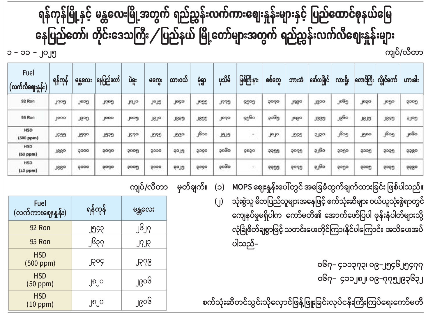ရန်ကုန်မြို့နှင့် မန္တလေးမြို့အတွက် ရည်ညွှန်းလက်ကားဈေးနှုန်းများနှင့် ပြည်ထောင်စုနယ်မြေနေပြည်တော်၊ တိုင်းဒေသကြီး/ပြည်နယ် မြို့တော်များအတွက် ရည်ညွှန်းလက်လီဈေးနှုန်းများ 11/01/2025
