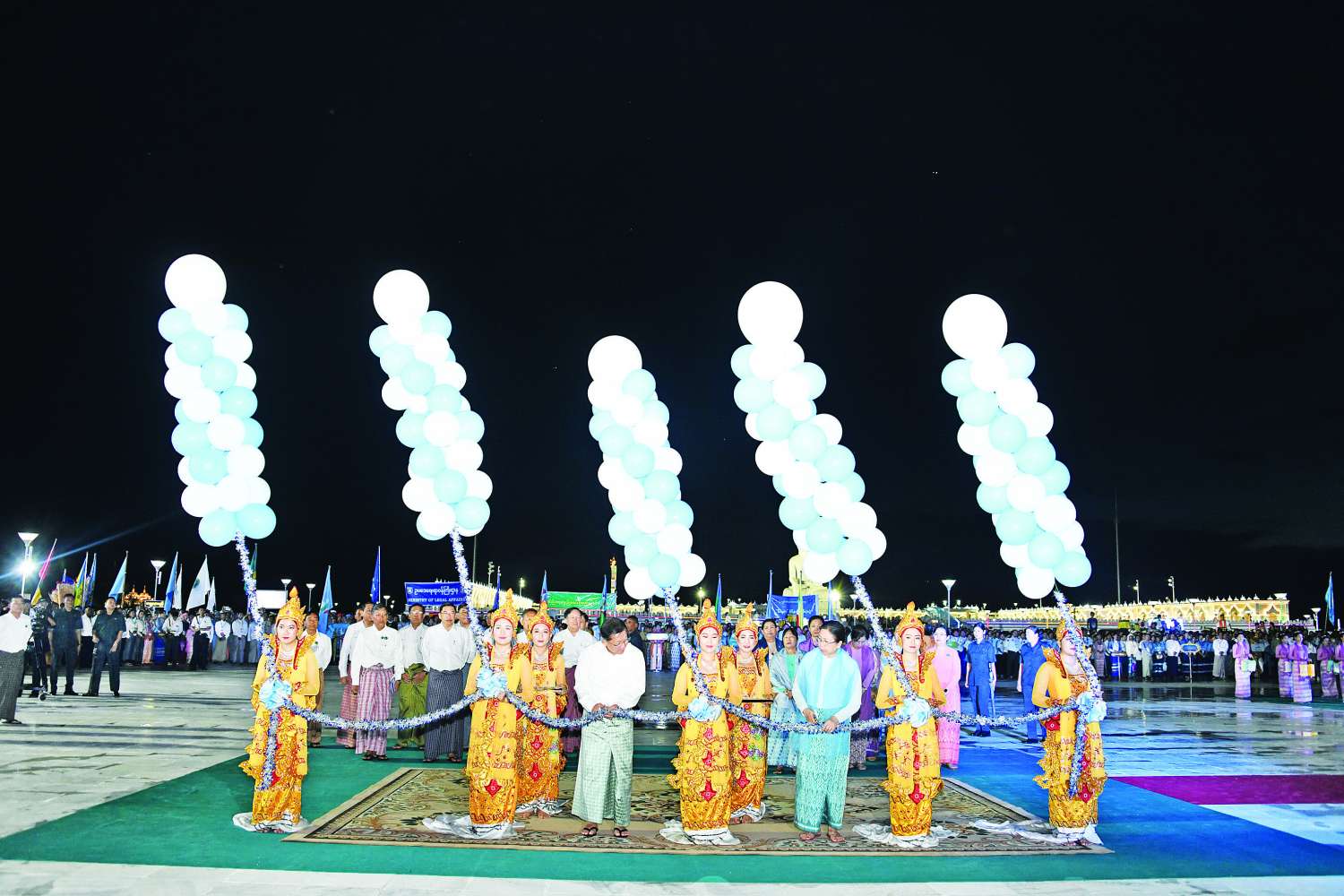 ထိုသို့ဖဲကြိုးဖြတ်ဖွင့်လှစ်သည်နှင့်တစ်ပြိုင်နက် မီးပုံးပျံငယ်များကို တစ်ပြိုင်နက် လွှတ်တင်ခြင်း၊ မီးရှူးမီးပန်းများ ပစ်ဖောက်ခြင်းနှင့် မြိုင်မြိုင်ဆိုင်ဆိုင် လတန်ဆောင်တိုင် တေးသီချင်းဖြင့် ကပြဖျော်ဖြေခြင်းများကိုဆောင်ရွက်ကြရာ နိုင်ငံတော်ယာယီသမ္မတ နိုင်ငံတော်လုံခြုံရေးနှင့်အေးချမ်းသာယာရေးကော်မရှင်ဥက္ကဋ္ဌနှင့် ဇနီး၊ အခမ်းအနားတက်ရောက်လာကြသူများက ကြည့်ရှုအားပေးကြသည်။