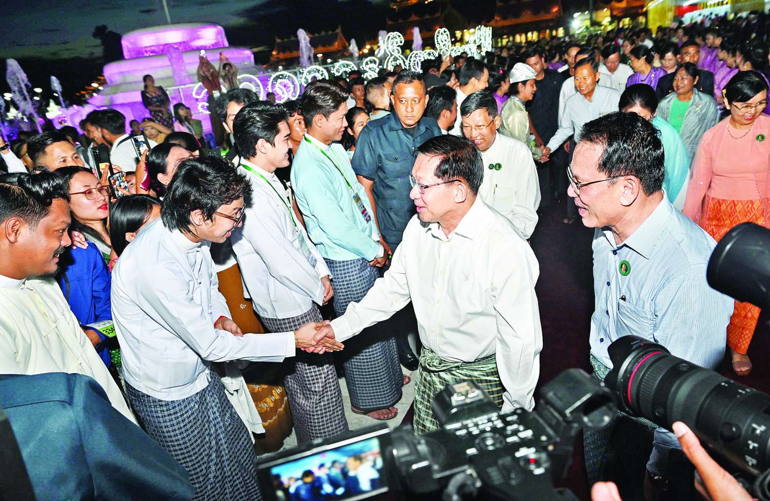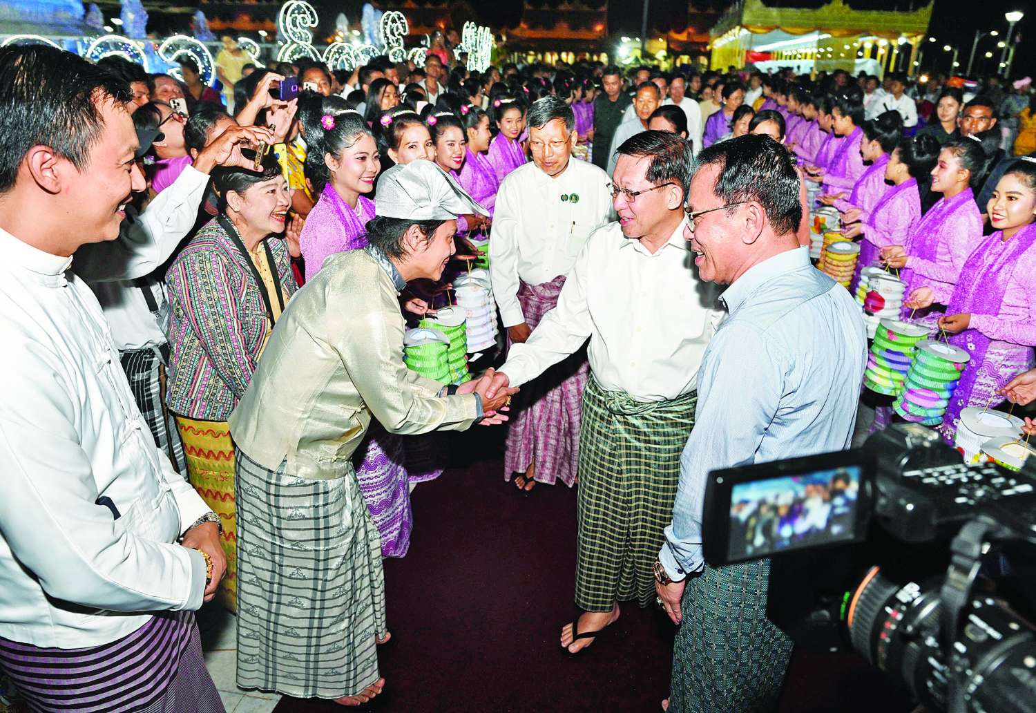 ဆက်လက်၍ နိုင်ငံတော်ယာယီသမ္မတ နိုင်ငံတော်လုံခြုံရေးနှင့်အေးချမ်းသာယာရေးကော်မရှင်ဥက္ကဋ္ဌနှင့် ဇနီး၊ အခမ်းအနားတက်ရောက်လာကြသူများသည် ညမီးကြီးမီးပုံးပျံများနှင့် စိန်နားပန်မီးပုံပျံများအား ပြိုင်ပွဲဝင်အသင်းများအလိုက် အသီးသီးလွှတ်တင်ပူဇော်ယှဉ်ပြိုင်မှုများကို ကြည့်ရှုအားပေးကြပြီး လာရောက်အားပေးကြသည့် မိဘပြည်သူများအား ရင်းရင်းနှီးနှီးနှုတ်ဆက်သည်။