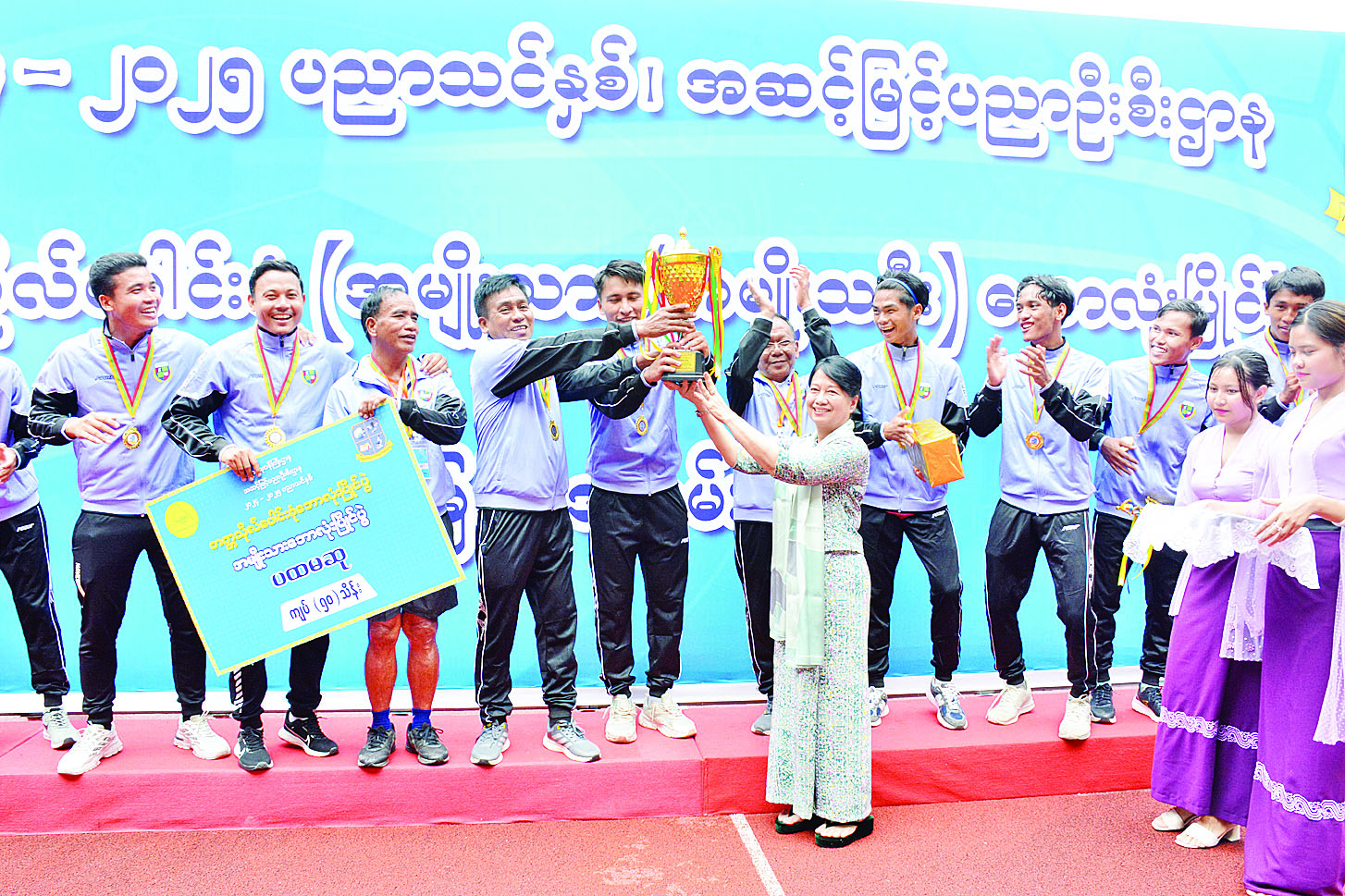 ယင်းနောက် ဒုတိယဝန်ကြီး ဒေါက်တာဇော်မြင့်က ပထမဆု ရရှိသော ပုသိမ်ဇုန် (အမျိုးသမီး) အသင်းကို တစ်ဦးချင်းဆုတံဆိပ်များ၊ ငွေကျပ်သိန်း ၅၀ နှင့် တံခွန် စိုက်ဆုဖလားကိုလည်းကောင်း၊ ပြည်ထောင်စုဝန်ကြီး ဒေါက်တာချောချောစိန်က ပထမဆုရ ပုသိမ်ဇုန် (အမျိုးသား) အသင်းကို တစ်ဦး ချင်းဆုတံဆိပ်များ၊ ငွေကျပ်သိန်း ၅၀ နှင့် တံခွန်စိုက်ဆုဖလားကိုလည်းကောင်း၊ ဒိုင်လူကြီးများအား ဂုဏ်ပြုဆုငွေများကိုလည်းကောင်း ပေးအပ်ချီးမြှင့်ခဲ့ကြောင်း သိရသည်။
