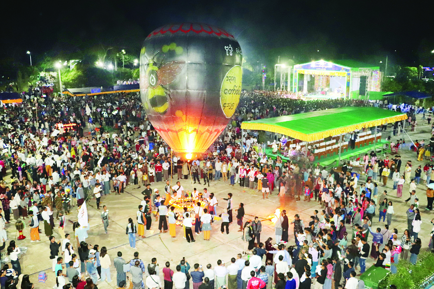 ထို့နောက် ပြည်နယ်ဝန်ကြီးချုပ်နှင့် တာဝန်ရှိသူများနှင့် ကန္ဒာဟေဝန်ပန်းခြံ ကျောက်သားရင်ပြင်ကွင်းအတွင်း၌ ပွဲတော်လာဧည့်ပရိသတ်များက စိန်နားပန်မီးပုံးပျံများနှင့် မီးပုံးပျံငယ်များလွှတ်တင်ပူဇော်မှုကို ကြည့်ရှုအားပေးပြီး မီးရှူးမီးပန်းများပစ်ဖောက်၍  ပွဲတော်ကိုပျော်ရွှင်စွာဆင်နွှဲကြကာ ကန္ဒာဟေဝန်ပန်းခြံ ကျောက်သားရင်ပြင်တွင် နိုင်ငံကျော်တေးသံရှင်များ၏ တန်ဆောင်တိုင်ပွဲတော် တေးဂီတဖျော်ဖြေပွဲကို ကြည့်ရှုအားပေးသည်။
