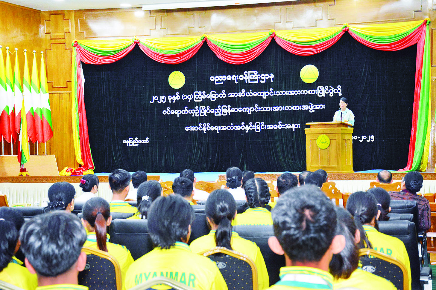 ၂၀၂၅ ခုနှစ် (၁၄) ကြိမ်မြောက် အာဆီယံကျောင်းသားအားကစားပြိုင်ပွဲသို့ ဝင်ရောက်ယှဉ်ပြိုင်မည့် မြန်မာကျောင်းသားအားကစားအဖွဲ့အား အောင်နိုင်ရေးအလံ အပ်နှင်းခြင်းအခမ်းအနားကို ယနေ့ညနေပိုင်းက နေပြည်တော် ရုံးအမှတ် (၁၃) ပညာရေးဝန်ကြီးဌာန အစည်းအဝေးခန်းမ၌ ကျင်းပသည်။