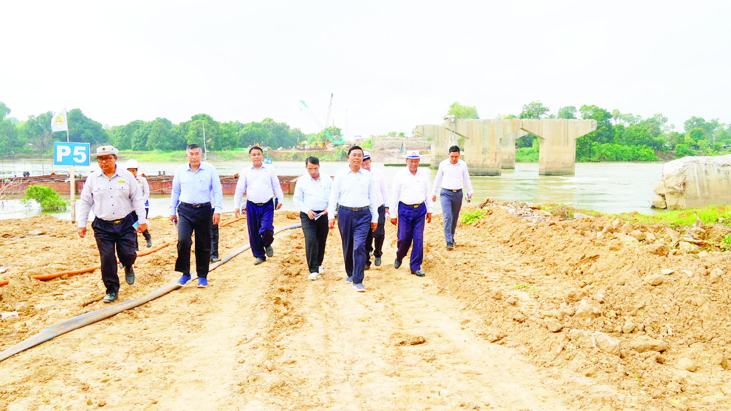 ယင်းနောက် မိုင်တိုင်(၃၆၀/၀)ရှိ ငလျင်ဒဏ်ကြောင့် ပျက်စီးခဲ့သော မြစ်ဆွတ်ချောင်းတံတား ပြုပြင်နေသည့်လုပ်ငန်းခွင်၌ ပင်မတံတားနှင့် ချဉ်းကပ်လမ်းများ ပြုပြင်နေမှုအခြေအနေတို့ကို ကြည့်ရှုစစ်ဆေးသည်။