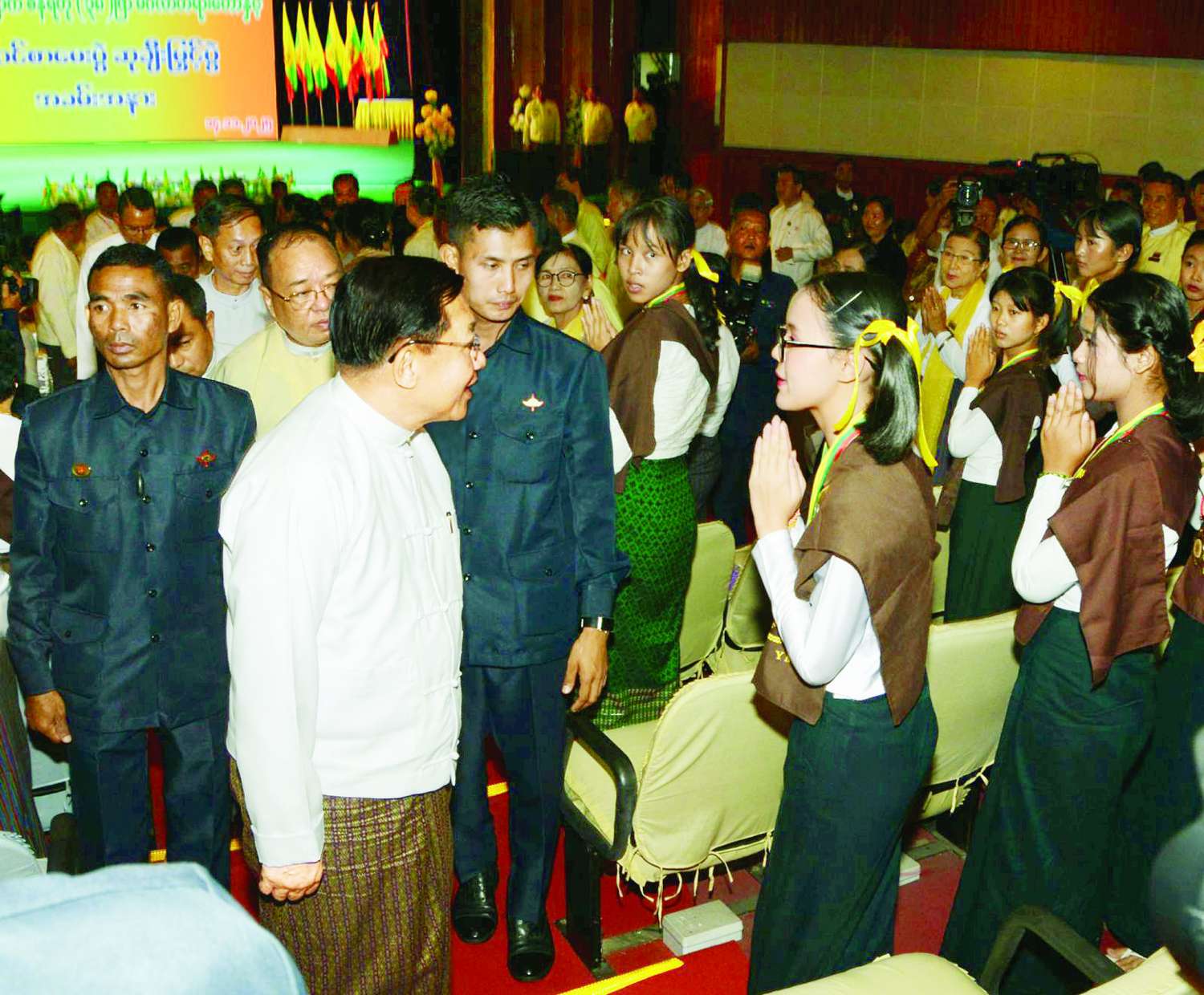 ယင်းနောက် အခမ်းအနားတက်ရောက်လာကြသည့် ကျောင်းသား၊ ကျောင်းသူများက (၃၈)ဖြာမင်္ဂလာတေးအား ရွတ်ဆိုကြပြီး ဇာတိမာန်သီချင်းအားသီဆိုကြရာ နိုင်ငံတော်ယာယီသမ္မတ နိုင်ငံတော်လုံခြုံရေးနှင့်အေးချမ်းသာယာရေးကော်မရှင်ဥက္ကဋ္ဌ ဗုဒ္ဓဘာသာကလျာဏယုဝအသင်း ရာသက်ပန်နာယကကြီး နှင့် အခမ်းအနားတက်ရောက်လာကြသူများက ကြည့်ရှုအားပေးကြသည်။
