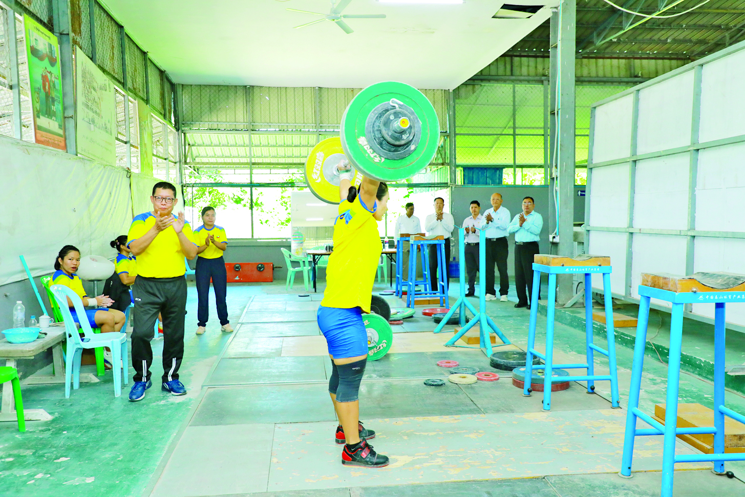 ဆက်လက်၍ ပြည်ထောင်စုဝန်ကြီးနှင့်အဖွဲ့သည် အလေးမလေ့ကျင့်ရေးရုံ၌ လေ့ကျင့်လျက်ရှိသည့် အလေးမအားကစားသမားများ၏ ဝိတ်တန်းများအလိုက် လေ့ကျင့်နေမှုများကို ကြည့်ရှုအားပေးပြီး မိမိတို့ရရှိထားသည့်စံချိန်ထက် သာလွန်ကောင်းမွန်စွာဖြင့် စံချိန်သစ်များရရှိခဲ့သည့် အားကစားသမား များနှင့် အုပ်ချုပ်/ နည်းပြများအား ဂုဏ်ပြုထောက်ပံ့ငွေများ ပေးအပ်ချီးမြှင့်ပြီး ပြိုင်ပွဲကာလနီးကပ်လာပြီဖြစ်၍ ပြိုင်ပွဲတွင် စံချိန်သစ်များ ထပ်မံတင်နိုင်ရေးအတွက် ကိုယ်စွမ်းဉာဏ်စွမ်းရှိသမျှ ကြိုးစားသွားကြရန်နှင့် ထိခိုက်ဒဏ်ရာများမရရှိအောင် အထူးဂရုစိုက်လေ့ကျင့်သွားကြရန် မှာကြားသည်။