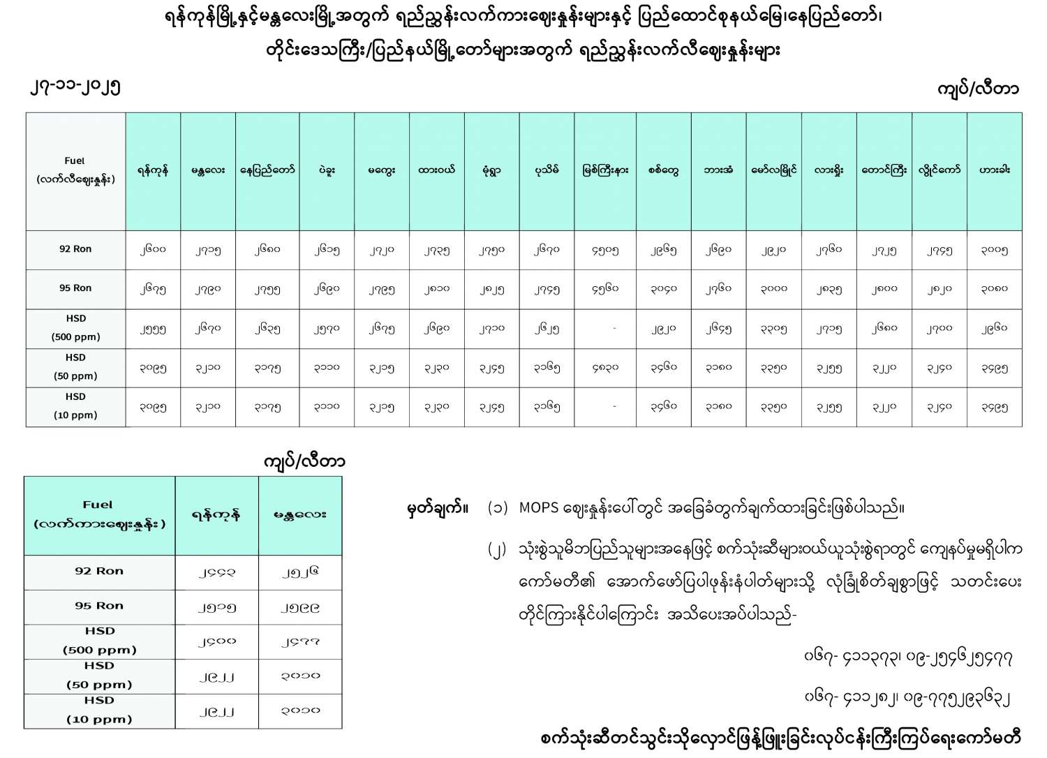 ရန်ကုန်မြို့နှင့် မန္တလေးမြို့အတွက် ရည်ညွှန်းလက်ကားဈေးနှုန်းများနှင့် ပြည်ထောင်စုနယ်မြေ နေပြည်တော်၊ တိုင်းဒေသကြီး/ပြည်နယ် မြို့တော်များအတွက် ရည်ညွှန်းလက်လီဈေးနှုန်းများ 11/27/2025