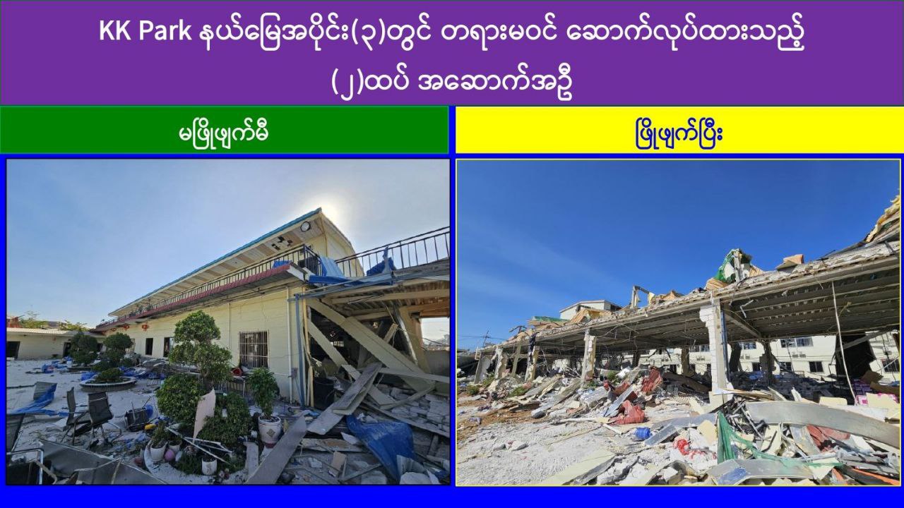 ထိုသို့ အွန်လိုင်းလိမ်လည်မှုများနှင့် အွန်လိုင်းလောင်းကစားမှုတိုက်ဖျက်ရေး လုပ်ငန်းများဆောင်ရွက်ရာတွင် မြဝတီ-မဲထော်သလေး(KK Park)နယ်မြေအတွင်းရှိ အွန်လိုင်းလိမ်လည်လောင်းကစားမှုများကျူးလွန်ရာတွင်အသုံးပြုခဲ့သည့် အဆောက်အအုံများကို အပိုင်း(၃)ပိုင်းခွဲ၍ စနစ်တကျဖြိုချဖျက်ဆီးခြင်းများ ဆောင်ရွက်လျက်ရှိရာ ယနေ့တွင်အပိုင်း (၃) နယ်မြေအတွင်းရှိ တရားမဝင်အဆောက်အအုံ ၇ လုံးကို ထပ်မံဖြိုချဖျက်ဆီးခဲ့သဖြင့် အပိုင်း(၃)နယ်မြေအတွင်းရှိ အဆောက်အအုံ ၄၂၅ လုံးအနက် ယနေ့အထိ ၁၁၅ လုံး ဖြိုချဖျက်ဆီးခဲ့ကြောင်းနှင့် KK Park နယ်မြေအတွင်းရှိ တရားမဝင် အဆောက်အအုံ စုစုပေါင်း ၆၃၅ လုံး အနက် ၂၆၃ လုံးကို ဖြိုချဖျက်ဆီးပြီးဖြစ်ကြောင်းသိရှိရသည်။