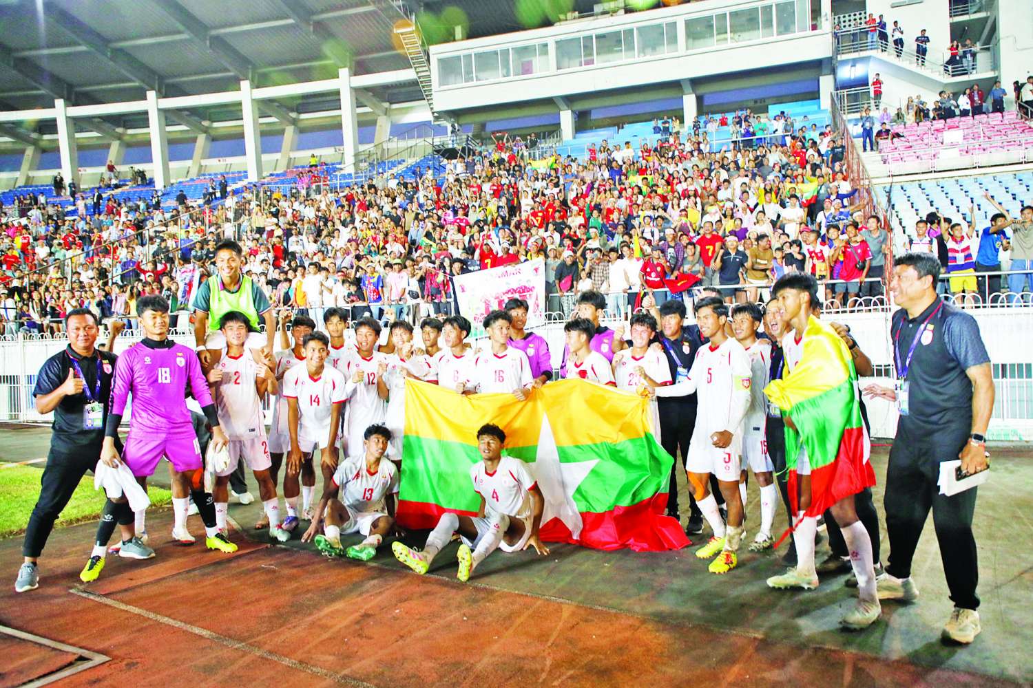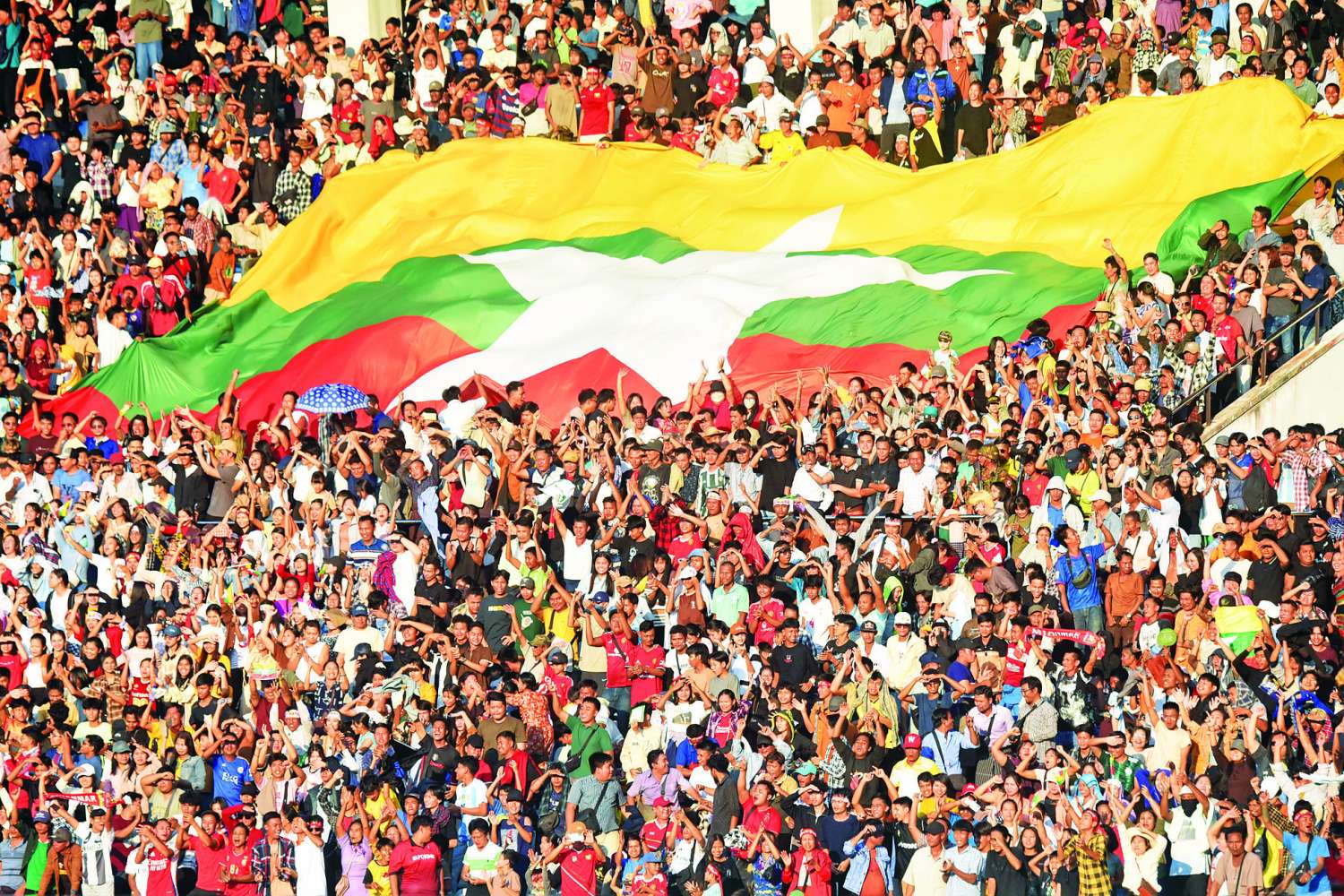 ၂၀၂၆ ခုနှစ် အာရှဖလားခြေစစ်ပွဲ U-17 အမျိုးသားဘောလုံးပြိုင်ပွဲ အုပ်စု (ဆ) ၏ ပြိုင်ပွဲ ပွဲစဉ်များကို ယနေ့ညနေပိုင်းတွင် ရန်ကုန်မြို့၊ ဝေဇယန္တာလမ်းရှိ လူငယ်အားကစားလေ့ကျင့်ရေးစခန်း သုဝဏ္ဏဘောလုံးကွင်း၌ ကျင်းပခဲ့ရာ နိုင်ငံတော်လုံခြုံရေးနှင့် အေးချမ်းသာယာရေးကော်မရှင်အတွင်းရေးမှူး၊ တွဲဖက်အမှုဆောင်ချုပ် ဗိုလ်ချုပ်ကြီး ရဲဝင်းဦး၊ ရန်ကုန်တိုင်းဒေသကြီး အစိုးရအဖွဲ့ဝန်ကြီးချုပ် ဦးစိုးသိန်း၊ ရန်ကုန်တိုင်းစစ်ဌာနချုပ် တိုင်းမှူး ဗိုလ်ချုပ် ပြည့်စုံလင်း၊ ရန်ကုန်တိုင်းဒေသကြီးအစိုးရအဖွဲ့ဝင် ဝန်ကြီးများ၊ အားကစားနှင့် ကာယပညာဦးစီးဌာနမှ ညွှန်ကြားရေးမှူးချုပ်နှင့် တာဝန်ရှိသူများ၊ မြန်မာနိုင်ငံဘောလုံးအဖွဲ့ချုပ်ဥက္ကဋ္ဌနှင့် အမှုဆောင်များ၊ ဌာနဆိုင်ရာများမှ တာဝန်ရှိသူများ၊ ဖိတ်ကြားထားသော ဧည့်သည်တော်များနှင့် ဘောလုံးအားကစားဝါသနာရှင်ပရိသတ် အင်အားသုံးသောင်းကျော်ဖြင့် ကွင်းလုံးပြည့်တစ်ခဲနက်လာရောက်ကြည့်ရှုအားပေးကြသည်။