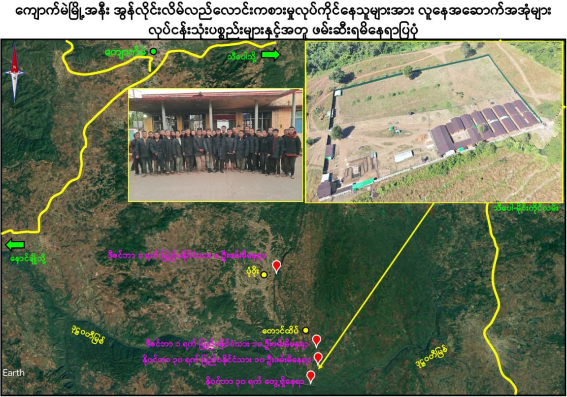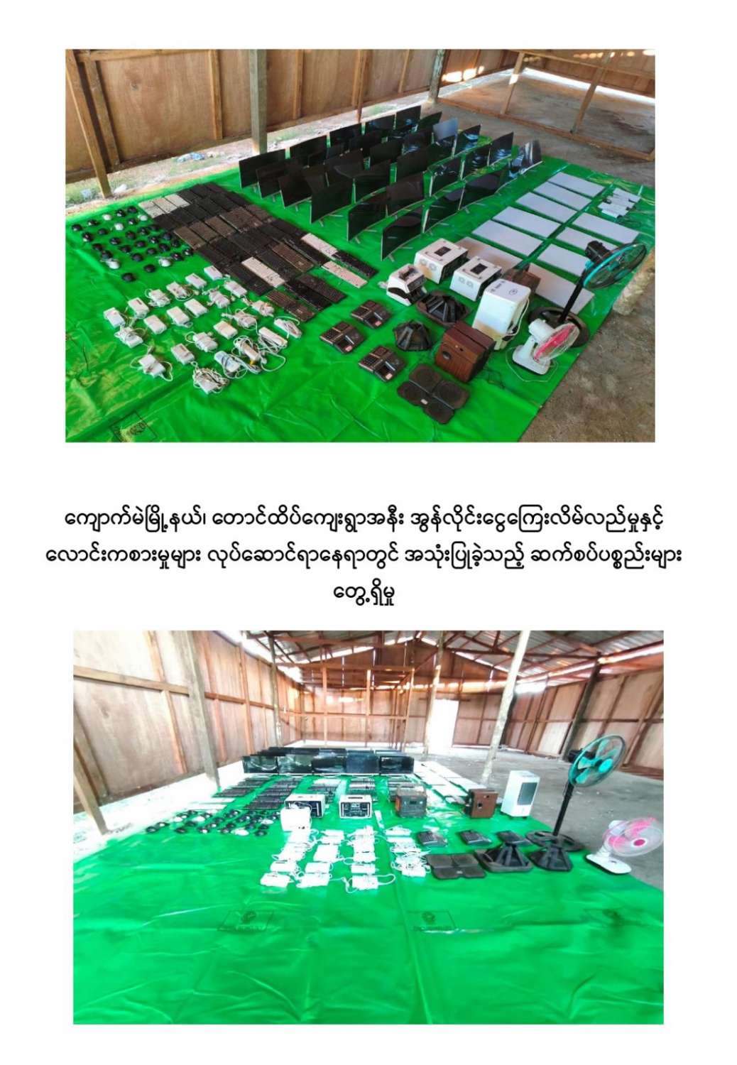 ကျောက်မဲမြို့နယ်အတွင်း နယ်မြေလုံခြုံရေးဆောင်ရွက်နေသည့် လုံခြုံရေးတပ်ဖွဲ့ဝင်များသည် နိုဝင်ဘာ ၃၀ ရက်တွင် ကျောက်မဲမြို့နယ်၊ တောင်ထိပ်ကျေးရွာ၏တောင်ဘက် ဒုဋ္ဌဝတီမြစ်အနီးသို့ရောက်ရှိစဉ် မသင်္ကာဖွယ်ရာအဆောက်အအုံများကိုတွေ့ရှိရသဖြင့် ဝင်ရောက်ရှာဖွေစစ်ဆေးခဲ့ရာ အွန်လိုင်းငွေကြေးလိမ်လည်မှုနှင့် လောင်းကစားမှုများ လုပ်ဆောင်နေသည့်နေရာဖြစ်ကြောင်းတွေ့ရှိရပြီး လုပ်ငန်းလုပ်ကိုင်နေကြသူများအား မတွေ့ရှိရဘဲ အလျား ၆၀ ပေ၊ အနံ ၃၀ ပေ ရှိ သွပ်မိုး ၃ ထပ်သားကာ အိပ်ဆောင် ၆ လုံး၊ အလျား ၆၀ ပေ၊ အနံ ၃၀ ပေ ရှိ သွပ်မိုး ၃ ထပ်သားကာ လုပ်ငန်းဆောင် ၅ လုံး၊ အလျား ၆၀ ပေ၊ အနံ ၃၀ ပေ ရှိ သွပ်မိုး ၃ ထပ်သားကာ အစားအစာသိုလှောင်ရုံ ၆ လုံး၊ အလျား ၆၀ ပေ၊ အနံ ၃၀ ပေ ရှိ ဆောက်လုပ်ဆဲလုပ်ငန်းဆောင် ၁ လုံး၊ အလျား ၆၀ ပေ၊ အနံ ၃၀ ပေ ရှိ ဆောက်လုပ်ဆဲအိပ်ဆောင် ၁ လုံး၊ အလျား ၈၀ ပေ၊ အနံ ၁၅ ပေ ရှိအထွေထွေသုံးအဆောင် ၁ လုံး၊ အလျား ၈၀ ပေ၊ အနံ ၁၀ ပေ ရှိ ၃ထပ်သားကာ တန်းလျားရှည်အိမ်သာ အိမ်သာ ၁ လုံး၊ အလျား ၃၀ ပေ၊ အနံ ၁၀ ပေ ရှိ အိပ်ခန်းတွဲ ၄ ခန်းတွဲအိပ်ဆောင် ၁ လုံး၊ အိပ်ခန်း ၄ ခန်းတွဲ(ရိက္ခာစတိုပါ) နှစ်ထပ်ဆောင် ၁ လုံး၊ မီးစက်အကြီး ၁ လုံး၊ ၁၅ ပေအမြင့် ကင်းစောင့် သစ်သား မျှော်စင် ၅ လုံး၊ အလျား ၂၀ ပေ၊ အနံ ၁၀ ပေ၊ အိပ်ဆောင်တန်းလျား ၁ လုံး၊ အလျား ၇၀၀ ပေ၊ အနံ ၄၀၀ ပေ၊ သွပ်ကာခြံဝန်း ၁ ခု၊ ALL IN ONE DESKTOP ကွန်ပျူတာ ၃၀ လုံး၊ STAR LINK ဗန်း ၁၀ ခု AIR COOLER ၁ လုံး၊ XIAOMI ဝိုင်ဖိုင်စက် ၂ လုံး၊ SOUND BOX ၁ လုံး၊ POWER STATION ၃ လုံး၊ ငွေရေတွက်စက် ၁ လုံး၊ ငွေကဒ်ဖြတ်စက် ၃ လုံး၊ ကွန်ပျူတာ ဆက်စပ်ပစ္စည်းများနှင့် အခြားလျှပ်စစ်သုံးပစ္စည်းများကို တွေ့ရှိသိမ်းဆည်းရမိခဲ့ကြောင်း သိရှိရသည်။