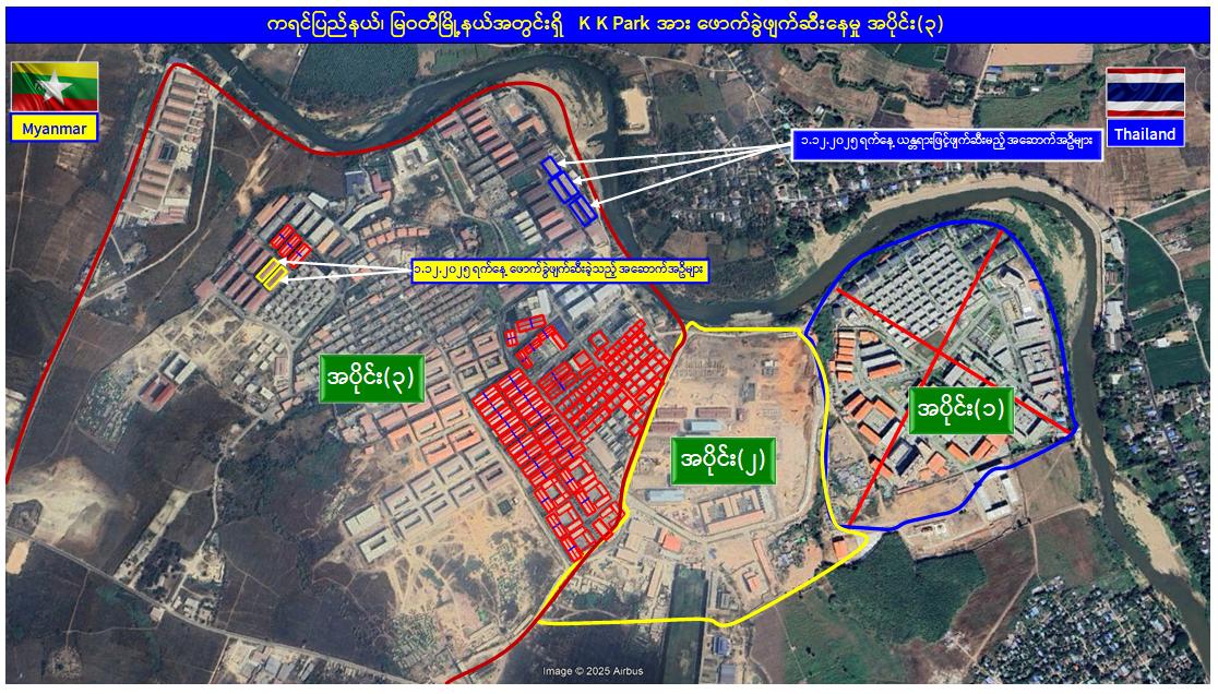 ထိုသို့ဆောင်ရွက်လျက်ရှိရာ ယနေ့တွင် မြဝတီ-မဲထော်သလေး (KK Park) အပိုင်း (၃) နယ်မြေအတွင်းရှိ တရားမဝင်အဆောက်အအုံများဖြစ်သော ၁ ထပ် အဆောက်အုံ ၁ လုံး၊ ၂ ထပ်အဆောက်အအုံ ၄ လုံး၊ ၄ ထပ်အဆောက်အအုံ ၂ လုံး၊ စုစုပေါင်း တရားမဝင်အဆောက်အအုံ ၇ လုံးကို ထပ်မံဖြိုချဖျက်ဆီးခဲ့သဖြင့် အပိုင်း (၃) နယ်မြေအတွင်းရှိ အဆောက်အအုံ ၄၂၅ လုံးအနက် ယနေ့အထိ ၁၃၅ လုံး ဖြိုချဖျက်ဆီးခဲ့ကြောင်းနှင့် KK Park နယ်မြေအတွင်းရှိ တရားမဝင်အဆောက်အအုံ စုစုပေါင်း ၆၃၅ လုံး အနက် ၂၈၃ လုံးကို ဖြိုချဖျက်ဆီးပြီးဖြစ်ကြောင်း သိရှိရသည်။