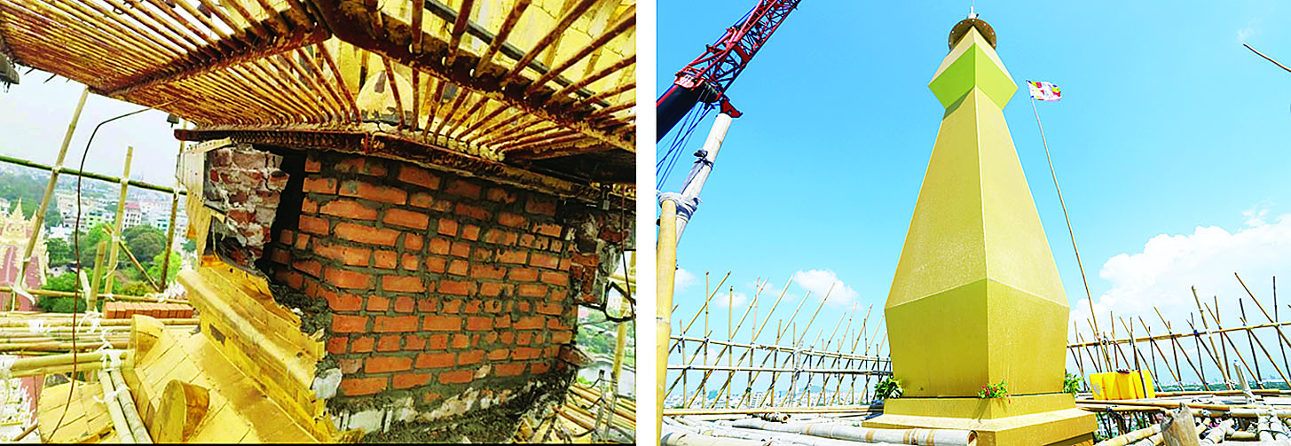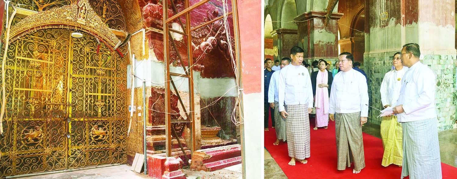 ထို့နောက် နိုင်ငံတော်ယာယီသမ္မတ နိုင်ငံတော်လုံခြုံရေးနှင့်အေးချမ်းသာယာရေးကော်မရှင်ဥက္ကဋ္ဌနှင့် အဖွဲ့ဝင်များသည်  မဟာမုနိဘုရားကြီးအား လက်ယာရစ်လှည့်လည်၍ ဘုရားကြီးရှိ သာသနိကအဆောက်အဦများတွင် ငလျင်ဒဏ်ကြောင့် ထိခိုက်ပျက်စီးခဲ့ရမှုများအား ရှေးမူမပျက် ပြန်လည်ပြုပြင်တည်ဆောက်မွမ်းမံခြင်းလုပ်ငန်းများ ဆောင်ရွက်ထားရှိမှုအခြေအနေများကို ကြည့်ရှုစစ်ဆေးပြီး တာဝန်ရှိသူများ၏ တင်ပြချက်များအပေါ် ပြန်လည်ပြုပြင်ခြင်းလုပ်ငန်းများ၊ အသစ်တည်ဆောက်ရသည့်လုပ်ငန်းများ ဆောင်ရွက်ရာတွင် ရေရှည်တည်တံ့ခိုင်မြဲရေးနှင့် စနစ်တကျဖြစ်စေရေး တွက်ချက်ဆောင်ရွက်သွားရန်နှင့် အခြားလိုအပ်သည်များ လမ်းညွှန်မှာကြားသည်။
