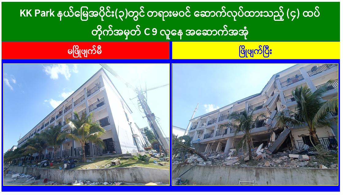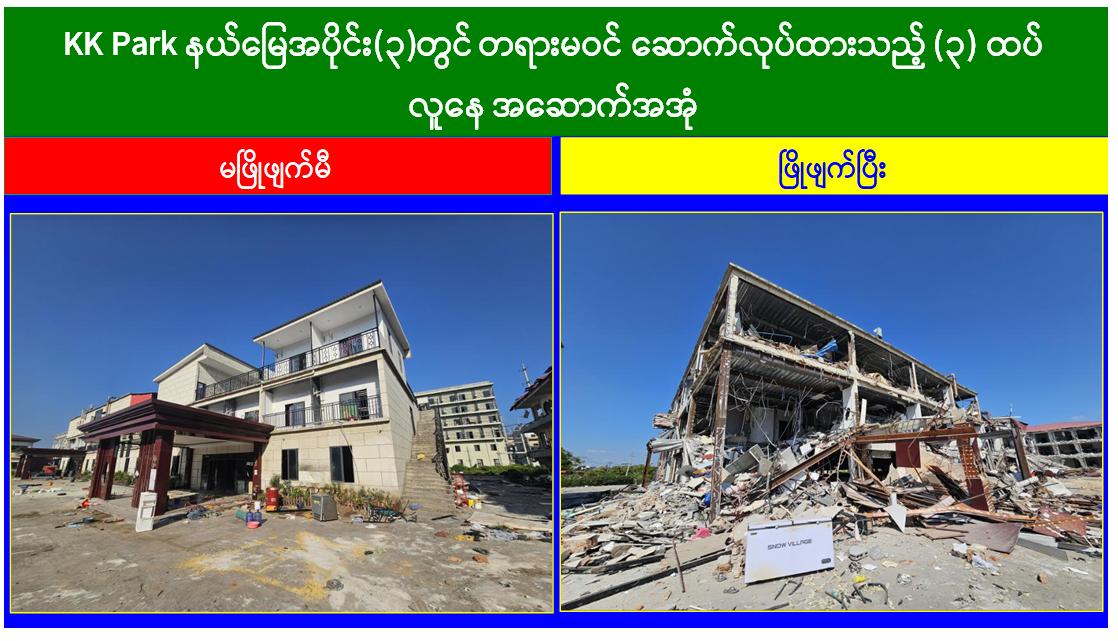 ယနေ့တွင် မြဝတီ-မဲထော်သလေး (KK Park) အပိုင်း(၃)နယ်မြေအတွင်းရှိ တရားမဝင်အဆောက်အအုံများဖြစ်သော ၂ ထပ်အဆောက်အအုံ ၁ လုံး၊ ၃ ထပ်အဆောက်အအုံ ၂ လုံး၊ ၄ ထပ်အဆောက်အအုံ ၁ လုံး၊ စုစုပေါင်း တရားမဝင်အဆောက်အအုံ ၄ လုံးကို ထပ်မံဖြို ချဖျက်ဆီးခဲ့သဖြင့် အပိုင်း(၃)နယ်မြေအတွင်းရှိ အဆောက်အအုံ ၄၂၅ လုံးအနက် ယနေ့အထိ ၁၄၉ လုံး ဖြိုချဖျက်ဆီးခဲ့ကြောင်းနှင့် KK Park နယ်မြေအတွင်းရှိ တရားမဝင် အဆောက်အအုံ စုစုပေါင်း ၆၃၅ လုံးအနက် ၂၉၇ လုံးကို ဖြိုချဖျက်ဆီးပြီးဖြစ်ကြောင်း သိရှိရသည်။