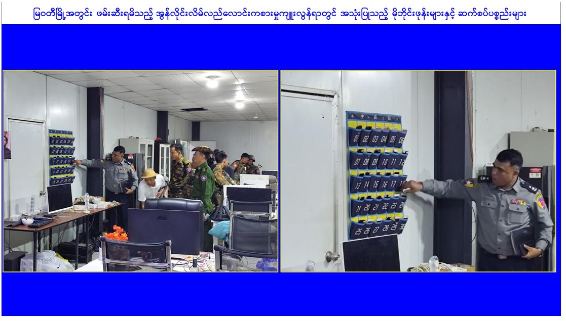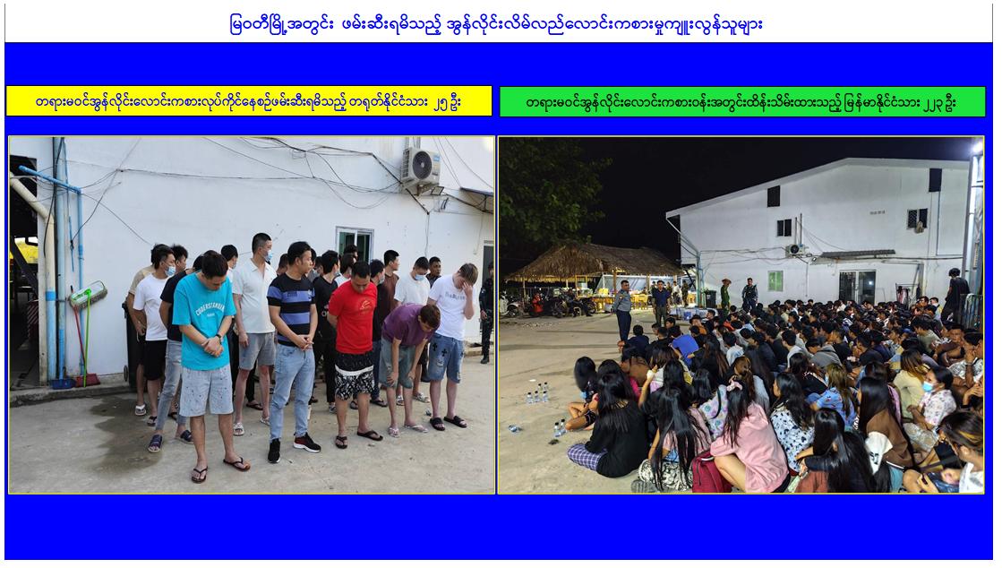 အွန်လိုင်းလောင်းကစားမှုများ၊ အွန်လိုင်းလိမ်လည်မှုများအပါအဝင် ဒုစရိုက်မှုများ ကျူးလွန်ခဲ့ကြသူများအား အင်တိုက်အားတိုက်ဖြင့် ကျယ်ကျယ်ပြန့်ပြန့် ရှာဖွေဖမ်းဆီး အရေးယူခြင်းများ ဆောင်ရွက်လျက်ရှိရာ ယနေ့တွင် မြဝတီမြို့ရှိ လုံခြုံရေးပူးပေါင်းအဖွဲ့များက သတင်းအရ မြဝတီမြို့ဝန်းကျင်တွင် ရှောင်တခင်စစ်ဆေးခြင်းများ ဆောင်ရွက်ခဲ့ရာ အမှတ်(၃) ရပ်ကွက်တွင် တရားမဝင်အွန်လိုင်းလောင်းကစားမှုများ၊ အွန်လိုင်းလိမ်လည်မှုများ ကျူးလွန်လျက်ရှိကြသည့် တရုတ်နိုင်ငံသား ၂၅ ဦး၊ မြန်မာနိုင်ငံသား ၂၂၃ ဦး စုစုပေါင်း ၂၄၈ ဦးအား တရားမဝင်အွန်လိုင်းလောင်းကစားနှင့် ငွေကြေးလိမ်လည်မှုများတွင် အသုံးပြုသည့် ကွန်ပျူတာမျိုးစုံ ၈၂ လုံး၊ မိုဘိုင်းဖုန်း ၉၂ လုံးနှင့် ဆက်စပ်ပစ္စည်းများနှင့်အတူ ဖမ်းဆီးရမိခဲ့ပြီး အဆိုပါဖမ်းဆီးရမိသူများအား ဥပဒေလုပ်ထုံးလုပ်နည်းများနှင့်အညီ စနစ်တကျ အရေးယူဆောင်ရွက်သွားမည်ဖြစ်သည်။ ထို့ပြင် အွန်လိုင်းလိမ်လည်မှုနှင့် လောင်းကစားမှုလုပ်ငန်းများ နေထိုင်လုပ်ကိုင်ခဲ့ကြသည့် ၃ ထပ် အဆောက်အအုံ ၅ လုံး၊ ၁ ထပ် အဆောက်အအုံ ၃ လုံး၊ စုစုပေါင်း ၈ လုံးတို့အား စစ်ဆေးတွေ့ရှိခဲ့ရပြီး ပြန်လည်အသုံးချမှုမရှိစေရေးအတွက် ၃ ထပ်အဆောက်အအုံ ၁ လုံးကို ယနေ့တွင် စတင်၍ စနစ်တကျ ဖြိုချဖျက်ဆီးခဲ့ကြောင်း သိရှိရသည်။