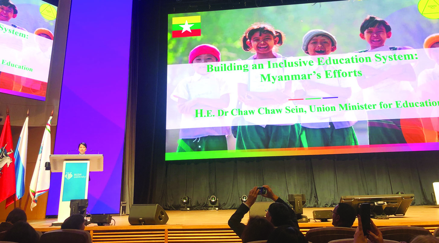 ထို့နောက် Plenary session အား ဆက်လက်ကျင်းပရာ ပြည်ထောင်စုဝန်ကြီးက “Building and Inclusive Education System: Myanmar’s Efforts” ခေါင်းစဉ်ဖြင့် ဆွေးနွေးပြောကြားရာတွင် မြန်မာနိုင်ငံအနေဖြင့် လူတိုင်းအကျုံးဝင် ပညာရေး (Inclusive Education) ကို အကောင်အထည်ဖော်ဆောင်ရွက်လျက်ရှိပါကြောင်း၊ မြန်မာနိုင်ငံ၏ ၂၀၀၈ ခုနှစ် ဖွဲ့စည်းပုံအခြေခံဥပဒေနှင့် အမျိုးသားပညာရေးဥပဒေများတွင် အခမဲ့အခြေခံပညာသင်ကြားပေးခြင်း၊ ခွဲခြားမှုမရှိဘဲ ပညာသင်ကြားပေးခြင်း စသည့်အချက်များ ပြဋ္ဌာန်းထားရှိပါကြောင်း၊ အမျိုးသားပညာရေး မဟာဗျူဟာစီမံကိန်း (NESP-2021-2030) တွင်လည်း ဝေးလံခေါင်ဖျားဒေသရှိသူများအပါအဝင် တိုင်းရင်းသားလူမျိုးများ၊ မသန်စွမ်းသူများ၊ အားလုံးပညာသင်ကြား ခွင့်ရရှိရေးကို ဆောင်ရွက်လျက် ရှိပါကြောင်း။