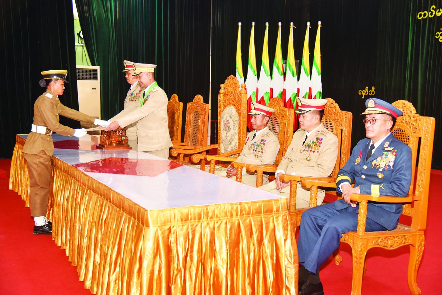 တပ်မတော်(ကြည်း)ဗိုလ်သင်တန်းကျောင်း(မှော်ဘီ) ဘွဲ့ရအမျိုးသမီးဗိုလ်လောင်းသင်တန်းအမှတ်စဉ်(၁၂) ပြန်တမ်းဝင်အရာရှိခန့်အပ်ခြင်းအခမ်းအနားကို ယနေ့နံနက်ပိုင်းတွင် တပ်မတော်(ကြည်း)ဗိုလ်သင်တန်းကျောင်း (မှော်ဘီ)မြဝတီခန်းမ၌ကျင်းပရာ ကာကွယ်ရေးဦးစီးချုပ်ရုံး(ကြည်း) စစ်ရာထူးခန့်ချုပ် ဒုတိယဗိုလ်ချုပ်ကြီး ထိန်ဝင်း၊ ကာကွယ်ရေးဦးစီးချုပ်ရုံးမှ တပ်မတော်အရာရှိကြီးများ၊ တပ်မတော်(ကြည်း)ဗိုလ်သင်တန်း ကျောင်း(မှော်ဘီ) ခေတ္တကျောင်းအုပ်ကြီး ဗိုလ်မှူးကြီးသက်ဆွေငြိမ်းနှင့် ကျောင်းဆင်းဗိုလ်လောင်းများ တက်ရောက်ကြသည်။