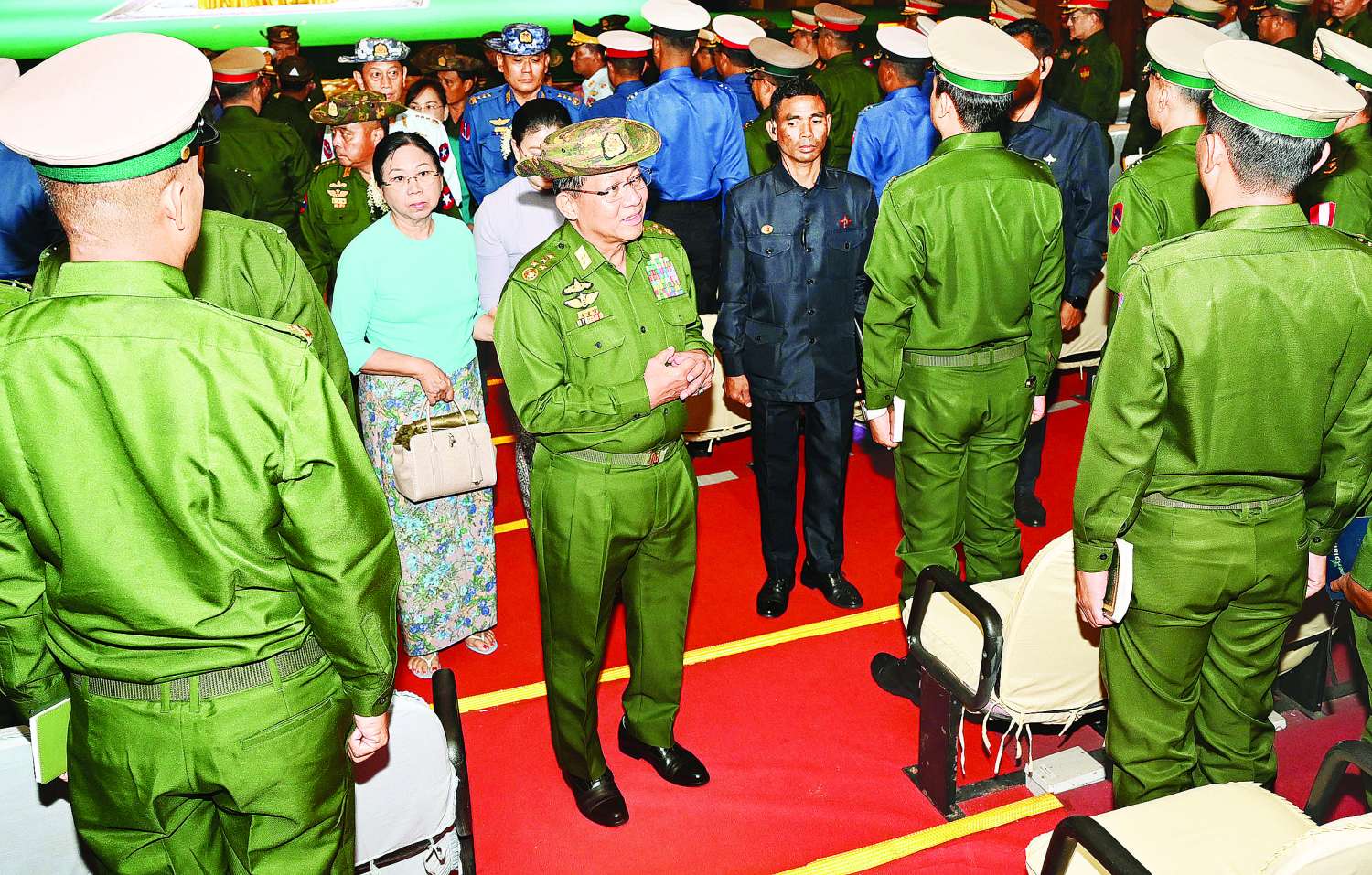 ထိုသို့တွေ့ဆုံရာတွင် နိုင်ငံတော်လုံခြုံရေးနှင့်အေးချမ်းသာယာရေးကော်မရှင်ဥက္ကဋ္ဌ တပ်မတော်ကာကွယ်ရေးဦးစီးချုပ်က တပ်မတော်အနေဖြင့် ၂၀၂၀ ပြည့်နှစ် ရွေးကောက်ပွဲတွင် ဖြစ်ပေါ်ခဲ့သည့် မဲမသမာမှုများကြောင့် နိုင်ငံတော်တာဝန်များကို ဖွဲ့စည်းပုံအခြေခံဥပဒေ (၂၀၀၈ ခုနှစ်) နှင့်အညီ ထမ်းဆောင်ခဲ့ရခြင်းဖြစ်ကြောင်း၊ စတင်တာဝန်ယူခဲ့ရသည့်အချိန်တွင် ဆူပူဆန္ဒပြမှုများ၊ လက်နက်ကိုင်အကြမ်းဖက်ခြင်းများ အတိုင်းအတာတစ်ခုအထိ ဖြစ်ပေါ်ခဲ့ပြီး ရန်ကုန်တိုင်းဒေသကြီး၌ ပိုမိုများပြားခဲ့ကြောင်း၊ ထို့ပြင် ကိုဗစ်-၁၉ ရောဂါ ဖြစ်ပေါ်နေသည့်ကာလလည်းဖြစ်ကြောင်း၊ မိမိတို့အနေဖြင့် ဆူပူဆန္ဒပြမှုများကို ထိန်းထိန်းသိမ်းသိမ်းဖြင့် ဖြေရှင်းနိုင်ခဲ့ပြီးနောက်ပိုင်းတွင် ဆူပူဆန္ဒပြမှုများနှင့် အကြမ်းဖက်မှုများကို လျော့ပါးသွားခဲ့ကြောင်း၊ ထိုကဲ့သို့ ဆူပူအကြမ်းဖက်မှုများ၊ ကိုဗစ်-၁၉ ရောဂါဖြစ်ပေါ်နေမှုများနှင့်ကြုံတွေ့နေရသည့်အချိန်တွင် နိုင်ငံရေးနှင့် နိုင်ငံ့အရေးကို ကွဲပြားစွာသိမြင်မှုမရှိဘဲ ဘေးပယောဂများ၊ လှုံ့ဆော်သွေးထိုးမှုများ၊ ခြိမ်း ခြောက်အကြပ်ကိုင်မှုများကြောင့် ပညာရေးနှင့် ကျန်းမာရေးဝန်ထမ်းများအပါအဝင် နိုင်ငံ့ဝန်ထမ်းများ လုပ်ငန်းခွင်စွန့်ခွာမှု DCS လုပ်ဆောင်မှုများကြောင့် အခက်အခဲ၊ အကြပ်အတည်းများနှင့်လည်း ရင်ဆိုင်ခဲ့ကြရကြောင်း၊ ထို့နောက် ၂၀၂၃ ခုနှစ်တွင် ကိုဗစ်-၁၉ ရောဂါဖြစ်ပွားမှုများ လျော့ပါးလာခဲ့ပြီး ဆူပူအကြမ်းဖက်မှုများသည်လည်း လျော့ပါးသွားခဲ့ကြောင်း၊ သို့သော် ရခိုင်ပြည်နယ်၌ မိုခါမုန်တိုင်းဖြစ်ပေါ်ခဲ့ပြီး ထိခိုက်ပျက်စီးမှုများ ဖြစ်ပေါ်ခဲ့သဖြင့် ပြန်လည်ထူထောင်ရေးနှင့် ပြန်လည်တည်ဆောက်ရေးလုပ်ငန်းများကို အမြန်ဆုံးဆောင်ရွက်ပေးသွားနိုင်ရန် တပ်မတော်မှ အရာရှိကြီးများအား တာဝန်ခွဲဝေပေးအပ်ခဲ့ပြီး ၆ လအတွင်း ဆောင်ရွက်ပေးနိုင်ခဲ့ကြောင်း။