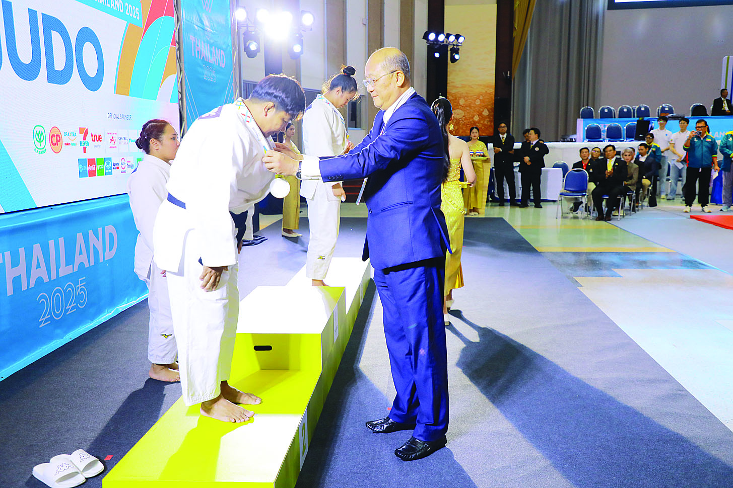 ဂျူဒိုအားကစားနည်း -၇၈ ကီလိုတန်းပြိုင်ပွဲတွင် မြန်မာအသင်းမှ ငွေတံဆိပ်ဆု ဆွတ်ခူးရရှိခဲ့သည့် အေးအေးအောင်၊ ယမန်နေ့က ယှဉ်ပြိုင်ခဲ့သော -၅၅ ကီလိုတန်းပြိုင်ပွဲတွင် ကြေးတံဆိပ်ဆုရရှိသည့် ထိုက်ထိုက်ကျော်၊ ခတ (Tori) ပြိုင်ပွဲတွင် ကြေးတံဆိပ်ဆုရရှိခဲ့သည့် လရောင်လျှံ၊ လှိုင်မင်းခန့်တို့ကို ပြည်ထောင်စု ဝန်ကြီး Jeng Phang နော်တောင်၊ မြန်မာအားကစားအဖွဲ့ခေါင်းဆောင် အားကစားနှင့်ကာယပညာဦးစီးဌာန ညွှန်ကြားရေးမှူးချုပ်၊ မြန်မာနိုင်ငံဂျူဒိုအဖွဲ့ချုပ်ဥက္ကဋ္ဌနှင့် လုပ်ငန်းရှင်များက ဂုဏ်ပြုချီးမြှင့်ငွေများ ပေးအပ်ချီးမြှင့်ခဲ့သည်။