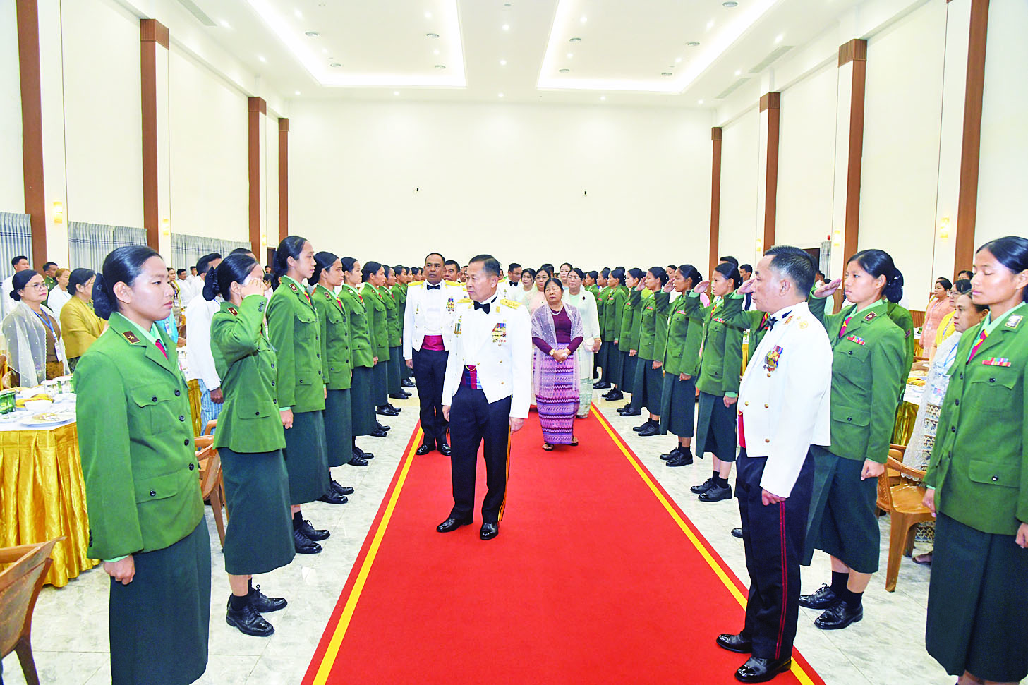 ညစာသုံးဆောင်အပြီးတွင် နိုင်ငံတော်လုံခြုံရေးနှင့် အေးချမ်းသာယာရေးကော်မရှင်ဒုတိယဥက္ကဋ္ဌ ဒုတိယတပ်မတော်ကာကွယ်ရေးဦးစီးချုပ်၊ ကာကွယ်ရေးဦးစီးချုပ်(ကြည်း)နှင့်အဖွဲ့ဝင်များသည် တပ်မတော်သူနာပြုနှင့် ဆေးဘက်ပညာတက္ကသိုလ် ဂုဏ်ပြုစစ်တီးဝိုင်း၏ ဂုဏ်ပြုတီးမှုတ်မှုအား ကြည့်ရှုအားပေးပြီး ချီးမြှင့်ငွေများ ပေးအပ်သည်။