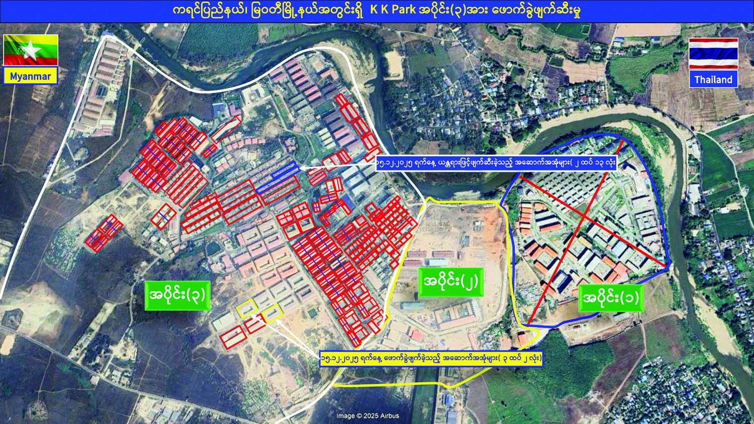 ထိုသို့ အွန်လိုင်းလိမ်လည် လောင်းကစားမှုတိုက်ဖျက်ရေးလုပ်ငန်းများ ဆောင်ရွက်လျက်ရှိရာ ယနေ့တွင် မြဝတီ-မဲ့ထော်သလေး (KK Park) နယ်မြေ အတွင်းရှိ အွန်လိုင်းလိမ်လည် လောင်းကစားမှုများ ကျူးလွန်ရာတွင် အသုံးပြုခဲ့သည့် အပိုင်း (၃) နယ်မြေအတွင်းရှိ တရားမဝင်သုံးထပ်အဆောက်အအုံ နှစ်လုံး၊ နှစ်ထပ်အဆောက်အအုံ ၁၃ လုံး၊ စုစုပေါင်း တရားမဝင်အဆောက်အအုံ ၁၅ လုံးကို ထပ်မံဖြိုချဖျက်ဆီးခဲ့သဖြင့် KK Park နယ်မြေအတွင်းရှိ တရားမဝင်အဆောက်အအုံ စုစုပေါင်း ၆၃၅ လုံးအနက် ၄၄၄ လုံးကို စနစ်တကျဖြိုချဖျက်ဆီးပြီးဖြစ်ကြောင်း သိရသည်။