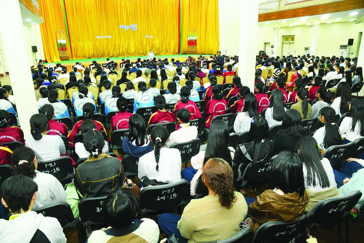 တွေ့ဆုံစဉ် ကော်မရှင်ဒုတိယဥက္ကဋ္ဌ ဒုတိယတပ်မတော်ကာကွယ်ရေးဦးစီးချုပ် ကာကွယ်ရေးဦးစီးချုပ်(ကြည်း) က အမှာစကားပြောကြားရာတွင် ယနေ့လူငယ်နောင်ဝယ်လူကြီးဖြစ်လာမည့် ကျောင်းသား၊ ကျောင်းသူများအနေဖြင့် နိုင်ငံတော်၏တာဝန်များကို ပခုံးပြောင်း တာဝန်ထမ်းဆောင်ကြရမည့်သူများဖြစ် ကြောင်း၊ ပညာရေးနှင့် ပတ်သက်၍ မိမိတို့နိုင်ငံ၏ လက်ရှိလူဦးရေသည် ၂၀၁၄ ခုနှစ်၊ လူဦးရေနှင့် အိမ်အကြောင်းအရာ သန်းခေါင်စာရင်းအရ ၅၁ သန်းကျော်ရှိပြီး ပြည်ထောင်စုအဆင့် လူဦးရေ ၂၂ သန်း ကျော်၌ စာတတ်မြောက်မှုနှုန်းသည် ၉၂ ဒသမ ၁၁ ရာခိုင်နှုန်း ဖြစ်သည်ကို တွေ့ရှိရကြောင်း၊ အသက်အပိုင်းအခြားဖြင့် ကြည့်မည်ဆိုပါက ၁၅ နှစ်နှင့် ၆၄ နှစ်ကြား လူဦးရေအချိုးမှာ ပြည်ထောင်စု အဆင့် ၆၆ ဒသမ ၉ ရာခိုင်နှုန်းရှိပြီး လူဦးရေ၏ တစ်ဝက်ကျော်ရှိသည်ကို တွေ့ရှိရကြောင်း၊ လူဦးရေ ၅၁ သန်းတွင် ကျောင်းနေအရွယ်များကို ကြည့်မည်ဆိုပါက ကလေးငယ် ၁၀ ဦးလျှင် ၉ ဦး သည် ကျောင်းတက်လျက်ရှိပြီး ၉၀ ရာခိုင်နှုန်းဖြစ်ကြောင်း၊ ကျောင်းနေအရွယ် အသက် ၁၀ နှစ်မှ ၁၄ နှစ်တွင် ၉၄ ဒသမ ၈ ရာခိုင်နှုန်းတွေ့ရှိရကြောင်း၊ ကျောင်းနေအရွယ် အသက် ၁၅ နှစ်မှ ၁၉ နှစ် အခြေခံပညာအဆင့်တွင် ၄၅ ဒသမ ၃ ရာခိုင်နှုန်း ရှိပြီး အသက် ၂၀ နှစ်မှ ၂၄ နှစ် တက္ကသိုလ် အဆင့်တွင် ၁၅ ရာခိုင်နှုန်းသာ ရှိသည်ကို တွေ့ရှိရပြီး အသက် ၂၅ နှစ် အထက်တွင် မရှိသလောက်နည်းပါးကြောင်း၊ တန်းစဉ်ကူးပြောင်းမှုနှင့်ပတ်သက်၍ မိမိတို့နိုင်ငံတွင် များစွာအားနည်းမှုရှိနေသည်ကို တွေ့ရှိရကြောင်း။