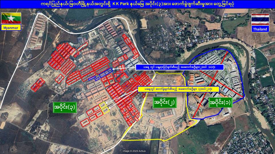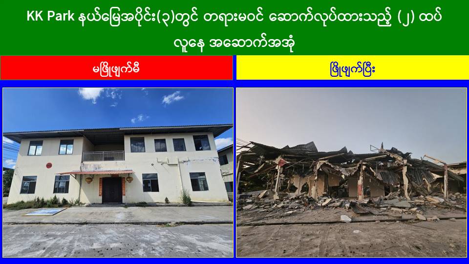ထိုသို့ အွန်လိုင်းလိမ်လည်လောင်းကစားမှုတိုက်ဖျက်ရေးလုပ်ငန်းများ ဆောင်ရွက်လျက်ရှိရာ ယနေ့တွင် မြဝတီ-မဲထော်သလေး (KK Park) နယ်မြေအတွင်းရှိ အွန်လိုင်းလိမ်လည်လောင်းကစားမှုများကျူးလွန်ရာတွင် အသုံးပြုခဲ့သည့် အပိုင်း(၃)နယ်မြေအတွင်းရှိ တရားမဝင် ၃ ထပ်အဆောက်အအုံ ၅ လုံး၊ ၂ ထပ်အဆောက်အအုံ ၂ လုံးနှင့် ၁ ထပ်အဆောက်အအုံ ၃ လုံး၊ စုစုပေါင်း တရားမဝင်အဆောက်အအုံ ၁၀ လုံးကို ထပ်မံဖြိုချဖျက်ဆီးခဲ့သဖြင့် KK Park နယ်မြေအတွင်းရှိ တရားမဝင်အဆောက်အအုံ စုစုပေါင်း ၆၃၅ လုံး အနက် ၄၆၆ လုံးကို စနစ်တကျဖြိုချဖျက်ဆီးပြီးဖြစ်ကြောင်း သိရှိရသည်။