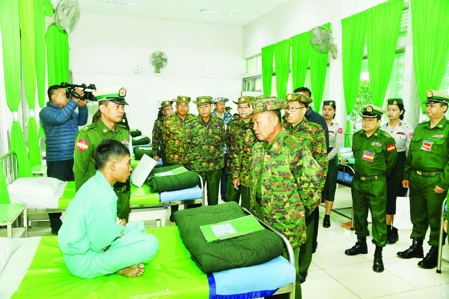 ထို့နောက် နိုင်ငံတော်လုံခြုံရေးနှင့် အေးချမ်းသာယာရေး ကော်မရှင် ဒုတိယဥက္ကဋ္ဌ ဒုတိယတပ်မတော် ကာကွယ်ရေးဦးစီးချုပ် ကာကွယ်ရေးဦးစီးချုပ်(ကြည်း)နှင့် အဖွဲ့ဝင်များသည်ဆေးရုံတွင် တက်ရောက်ဆေးကုသ မှုခံယူလျက်ရှိသည့် အရာရှိ၊ စစ်သည်၊ ပြည်သူ့စစ်(ဌာနေ)တပ်ဖွဲ့ဝင်များကို တစ်ဦးချင်းလိုက်လံကြည့်ရှု၍ ဒဏ်ရာရရှိမှု၊ ရောဂါဖြစ်ပွားမှုအခြေအနေများ၊ ဆေးဝါးကုသပေးထားမှု အခြေအနေများနှင့် ကျန်းမာရေးတိုးတက်ကောင်းမွန်လာမှု အခြေအနေများအား ရင်းရင်းနှီးနှီးလိုက်လံမေးမြန်း အားပေးစကားပြောကြားပြီး စားသောက်ဖွယ်ရာများနှင့် ဂုဏ်ပြုချီးမြှင့်ငွေများ ပေးအပ်သည်။
