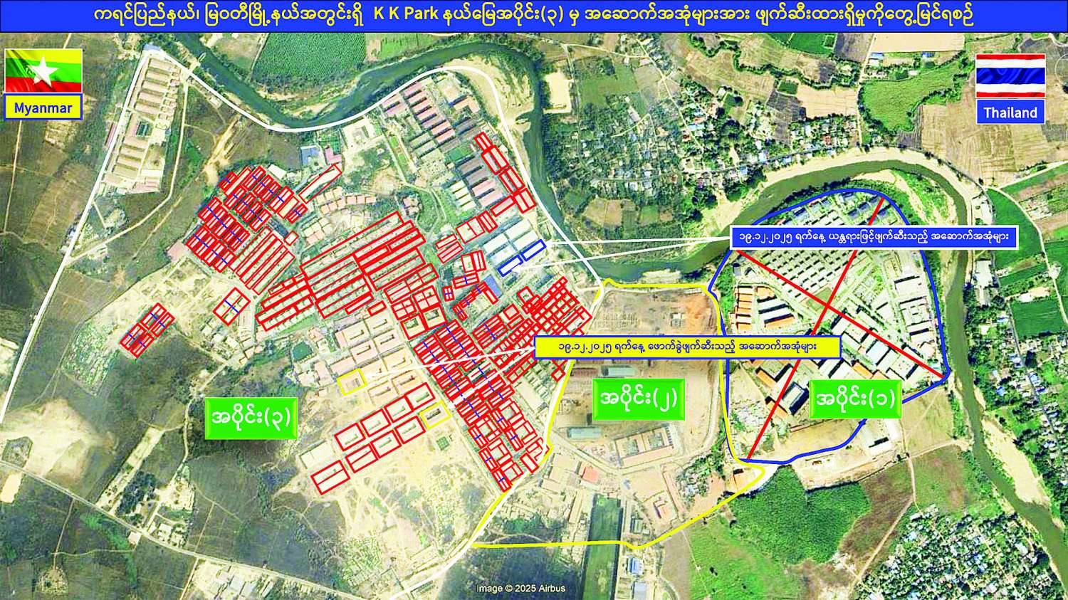 ထိုသို့ အွန်လိုင်းလိမ်လည်လောင်းကစားမှုတိုက်ဖျက်ရေးလုပ်ငန်းများ ဆောင်ရွက်လျက်ရှိရာ ယနေ့တွင် မြဝတီ-မဲ့ထော်သလေး (KK Park) နယ်မြေအတွင်းရှိ အွန်လိုင်းလိမ်လည်လောင်းကစားမှုများ ကျူးလွန်ရာတွင် အသုံးပြုခဲ့သည့် အပိုင်း(၃)နယ်မြေအတွင်းရှိ တရားမဝင် နှစ်ထပ်အဆောက်အအုံနှစ်လုံး၊ လေးထပ်အဆောက်အအုံနှစ်လုံး၊ စုစုပေါင်းလေးလုံးကို ထပ်မံဖြိုချဖျက်ဆီးခဲ့သဖြင့် KK Park နယ်မြေအတွင်းရှိ တရားမဝင်အဆောက်အအုံ စုစုပေါင်း ၆၃၅ လုံးအနက် ၄၈၂ လုံးကို စနစ်တကျ ဖြိုချဖျက်ဆီးပြီးဖြစ်ကြောင်း သိရှိရသည်။