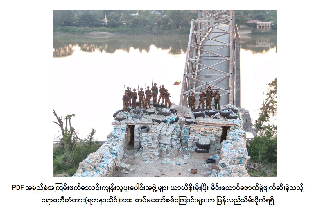 PDF အမည်ခံအကြမ်းဖက်သောင်းကျန်းသူပူးပေါင်းအဖွဲ့များအနေဖြင့် အဆိုပါဒေသအား ယာယီစိုးမိုးထားစဉ် မြို့/ရွာများအတွင်း ဘာသာရေးဆိုင်ရာ အဆောက်အအုံများ၊ စာသင်ကျောင်းများ၊ ဌာနဆိုင်ရာအဆောက်အအုံများ၊ ဆေးရုံများနှင့် လူနေအိမ်များအတွင်း ဝင်ရောက်နေရာယူ၍ ဘန်ကာများပြုလုပ်ခြင်း၊ ပြည်သူများ၏အိုးအိမ်များကို ခံစစ်တံတိုင်းအဖြစ်အကာကွယ်ရယူ၍ ပစ်ခတ်တိုက်ခိုက်ခြင်း၊ ပြည်သူများအဓိကသွားလာအသုံးပြုလျက်ရှိသည့် လမ်း/တံတားများအားမိုင်းထောင်ဖောက်ခွဲခြင်းများ ဆောင်ရွက်လျက်ရှိရာ အောက်တိုဘာ ၂၉ ရက်တွင်လည်း မန္တလေးတိုင်းဒေသကြီး၊ စဉ့်ကူးမြို့နှင့် စစ်ကိုင်းတိုင်းဒေသကြီး၊ ကျောက်မြောင်းမြို့ကို ဆက်သွယ်ထား၍ ပြည်သူလူထု၏ လမ်းပန်းဆက်သွယ်ရေးနှင့် ကုန်စည်စီးဆင်းမှုတို့အတွက်အဓိကအရေးပါသည့် ဧရာဝတီတံတား(ရတနာသိင်္ခ)ကိုလည်း မိုင်းထောင်ဖောက်ခွဲဖျက်ဆီးခဲ့သဖြင့် တံတား၏ရေလယ်တိုင်များဖြစ်သည့် တိုင်အမှတ် RP4 နှင့် RP5 တို့အကြားတွင်လည်းကောင်း၊ RP6-A2 ချဉ်းကပ်လမ်းနေရာတို့တွင်လည်းကောင်း ကျိုးကျပျက်စီးခဲ့သဖြင့် မော်တော်ယာဉ်များနှင့် ခရီးသွားပြည်သူများဖြတ်သန်း သွားလာနိုင်ခြင်းမရှိတော့ဘဲ ကုန်စည်စီးဆင်းမှုများ ရပ်တန့်ခဲ့ရသည်။