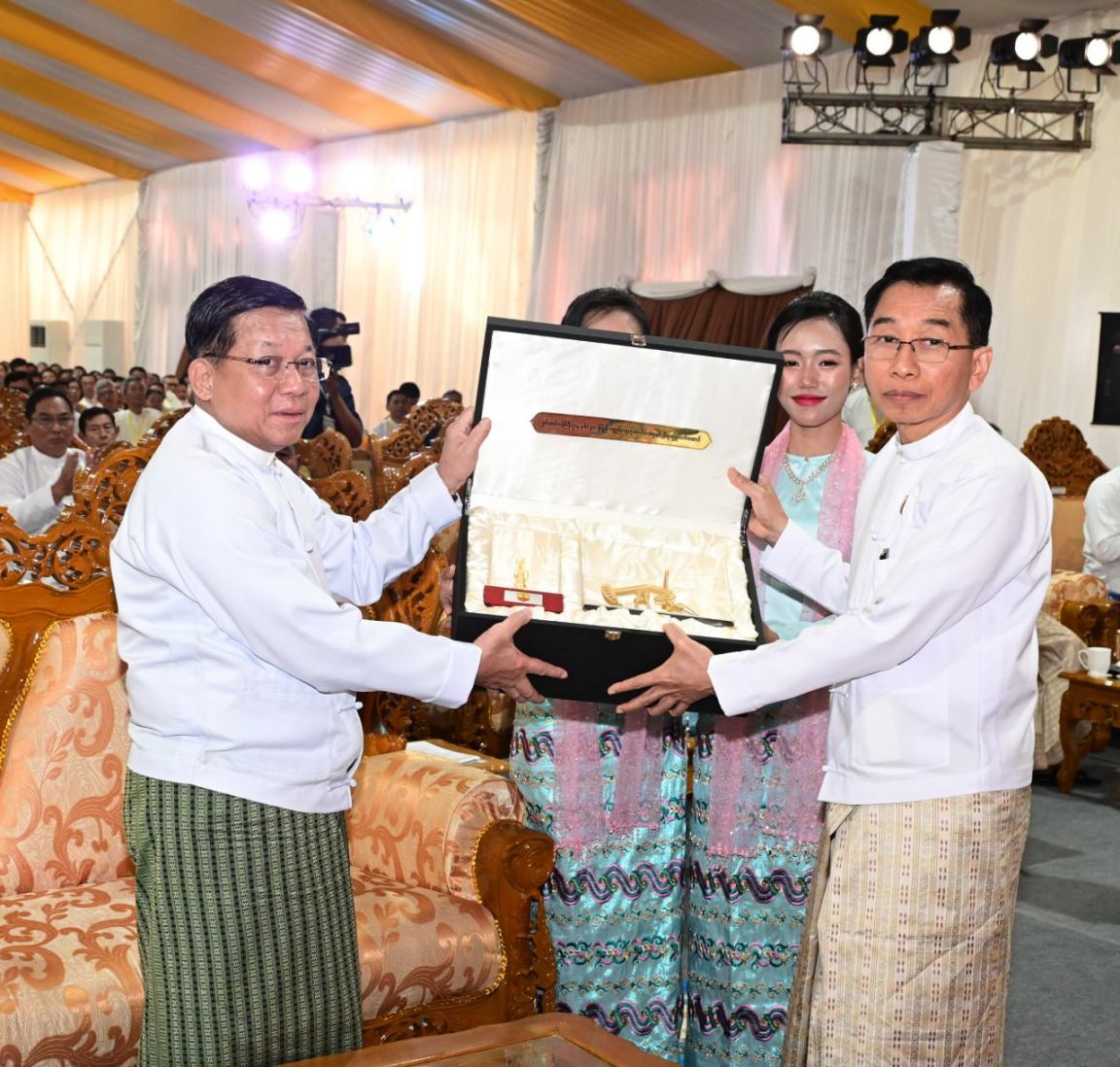 ယင်းနောက် နိုင်ငံတော်ယာယီသမ္မတ နိုင်ငံတော်လုံခြုံရေးနှင့် အေးချမ်းသာယာရေးကော်မရှင်ဥက္ကဋ္ဌထံသို့ စွမ်းအင်ဝန်ကြီးဌာန ပြည်ထောင်စုဝန်ကြီးက စွမ်းအင်ဝန်ကြီးဌာန နှစ် (၄၀) ပြည့် ပတ္တမြားရတုနှင့် သန်လျင်ရေနံချက်စက်ရုံရာပြည့် အထိမ်းအမှတ် ဂါရဝပြုလက်ဆောင်အားပေးအပ်သည်။