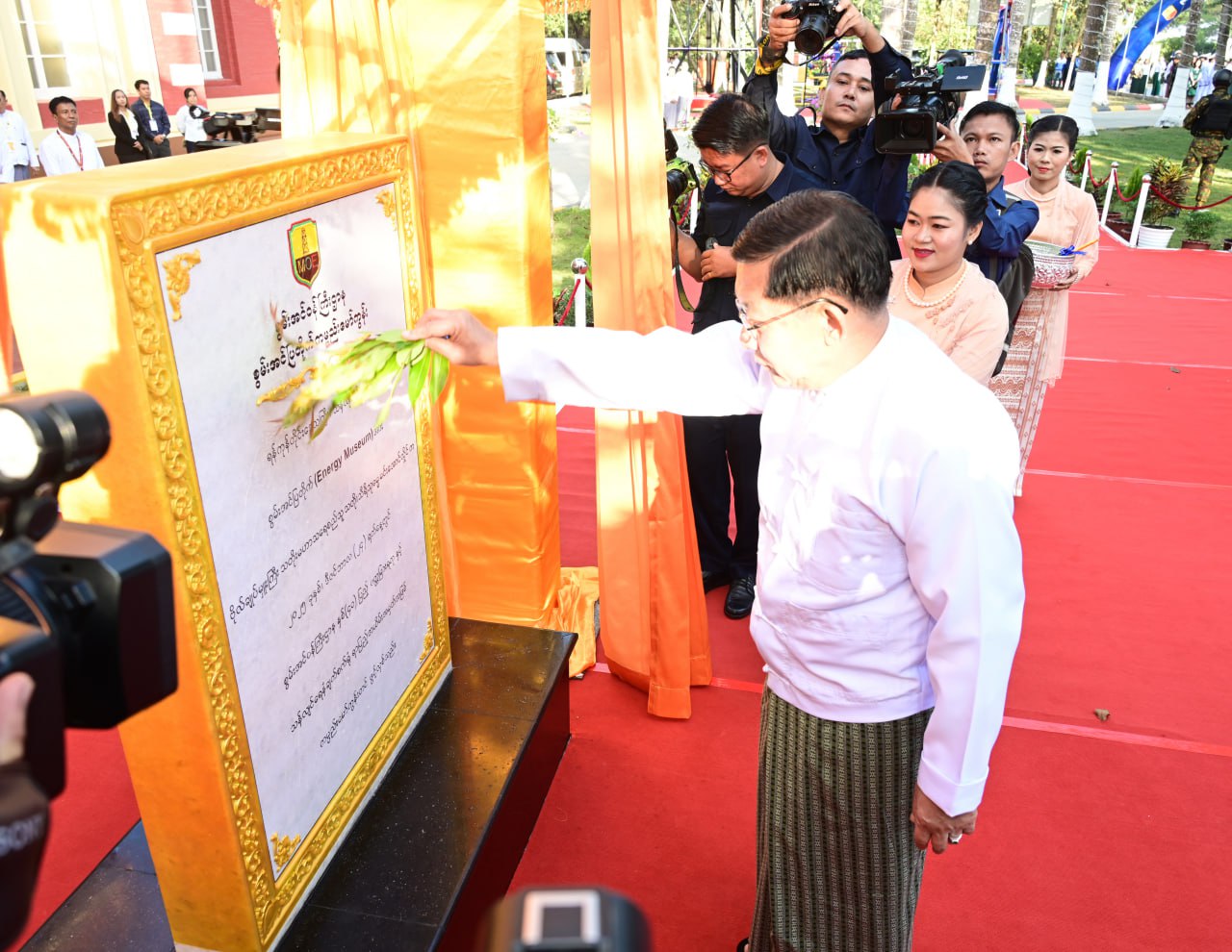 ယင်းနောက် နိုင်ငံတော်ယာယီသမ္မတ နိုင်ငံတော်လုံခြုံရေးနှင့်အေးချမ်းသာယာရေးကော်မရှင်ဥက္ကဋ္ဌက စွမ်းအင်ပြတိုက် ကမ္ပည်းမော်ကွန်းကျောက်စာတိုင်အား အမွှေးနံ့သာရည်များ ပက်ဖြန်းပေးသည်။ ဆက်လက်၍ ကော်မရှင်အတွင်းရေးမှူးနှင့် တက်ရောက်လာကြသူများက စွမ်းအင်ပြတိုက် ကမ္ပည်းမော်ကွန်းကျောက်စာတိုင်အား အမွှေးနံ့သာရည်များ ပက်ဖျန်းပေးကြသည်။