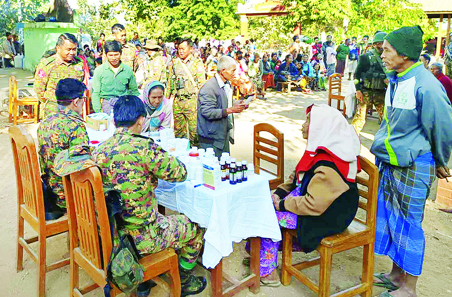 ထိုသို့ဆောင်ရွက်ပေးရာတွင် ဆေးကုသရေးအဖွဲ့က သာသနာနွယ်ဝင်သီလရှင်သုံးပါးနှင့် ဒေသခံပြည်သူ ၂၀၂ ဦးတို့ကို သွေးတိုးရောဂါ၊ အဆစ်အမျက်ရောင်ရောဂါ၊ ဆီးချိုရောဂါ၊ သားဖွားမီးယပ်ရောဂါ၊ အသက်ရှူလမ်းကြောင်းဆိုင်ရာရောဂါ၊ မျက်စိရောဂါ၊ သွားနှင့် ခံတွင်းရောဂါ၊ ခွဲစိတ်ကုသမှုဆိုင်ရာရောဂါ၊ ကလေးရောဂါ၊ အထွေထွေရောဂါတို့နှင့်ပတ်သက်၍ လိုအပ်သည့် ကျန်းမာရေးစစ်ဆေးကုသပေးခြင်းများ ဆောင်ရွက်ပေးခြင်းနှင့် ကျန်းမာရေးအသိပညာပေးဟောပြောဆွေးနွေးခြင်းများ ဆောင်ရွက်ပေးပြီး ဆေးရုံတက်ရောက်ကုသရန် လိုအပ်သူများအား နယ်မြေခံတပ်မတော်ဆေးရုံသို့ တက်ရောက်ကုသနိုင်ရေး စီစဉ်ဆောင်ရွက်ပေးသည်။