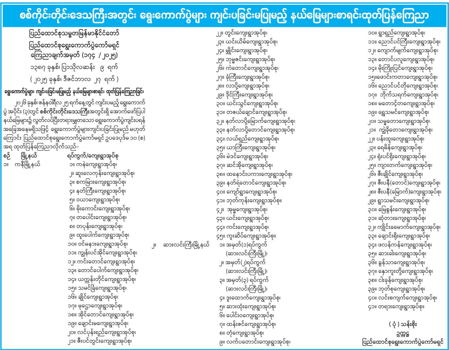 စစ်ကိုင်းတိုင်းဒေသကြီးအတွင်း ရွေးကောက်ပွဲများကျင်းပခြင်းမပြုမည့် နယ်မြေများစာရင်း ထုတ်ပြန်ကြေညာ 12/28/2025 စစ်ကိုင်းတိုင်းဒေသကြီးအတွင်း ရွေးကောက်ပွဲများကျင်းပခြင်းမပြုမည့် နယ်မြေများစာရင်း ထုတ်ပြန်ကြေညာ