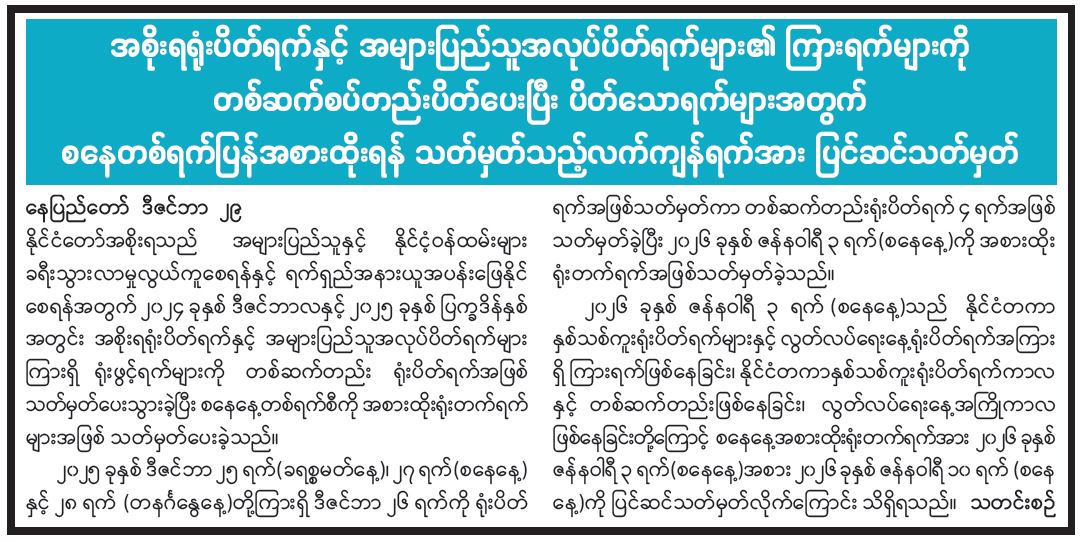 အစိုးရရုံးပိတ်ရက်နှင့် အများပြည်သူအလုပ်ပိတ်ရက်များ၏ ကြားရက်များကို တစ်ဆက်စပ်တည်း ပိတ်ပေးပြီး ပိတ်သောရက်များအတွက် စနေတစ်ရက်ပြန်အစားထိုးရန် သတ်မှတ်သည့် လက်ကျန်ရက်အား ပြင်ဆင်သတ်မှတ် 12/30/2025