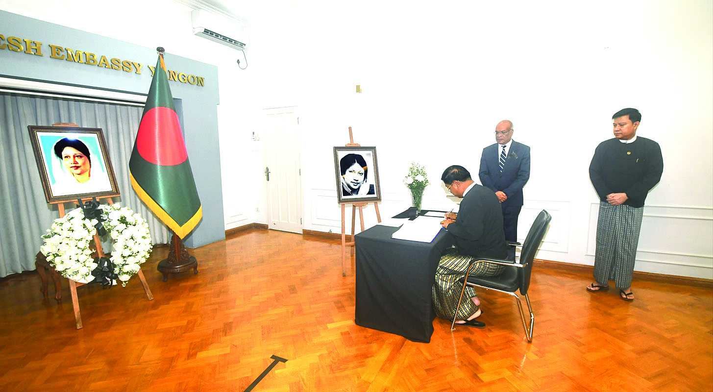 ဦးစွာ ပြည်ထောင်စုဝန်ကြီးသည် မြန်မာနိုင်ငံဆိုင်ရာ ဘင်္ဂလားဒေ့ရှ်နိုင်ငံသံရုံးမှ သံအမတ်ကြီးနှင့် တာဝန်ရှိသူများအား သံရုံးဧည့်ခန်းမ၌ တွေ့ဆုံနှုတ်ဆက်၍ ဘင်္ဂလားဒေ့ရှ်နိုင်ငံ၏ ပထမဆုံးအမျိုး သမီးဝန်ကြီးချုပ် ဘေဂမ်ခါလီဒါဇီယာ ကွယ်လွန်သွားခဲ့ခြင်းအပေါ် ပြည်ထောင်စုသမ္မတမြန်မာနိုင်ငံအစိုးရကိုယ်စား ဝမ်းနည်းမိပါကြောင်း၊ ဘင်္ဂလားဒေ့ရှ်နိုင်ငံအစိုးရ၊ ပြည်သူနှင့် မစ္စဘေဂမ်ခါလီဒါဇီယာ၏ မိသားစုဝင်များကို စာနာထောက်ထားပါကြောင်း သတင်းစကားပြောကြားပြီး ဝမ်းနည်းကြောင်း မှတ်တမ်းစာအုပ်တွင် လက်မှတ်ရေးထိုးသည်။